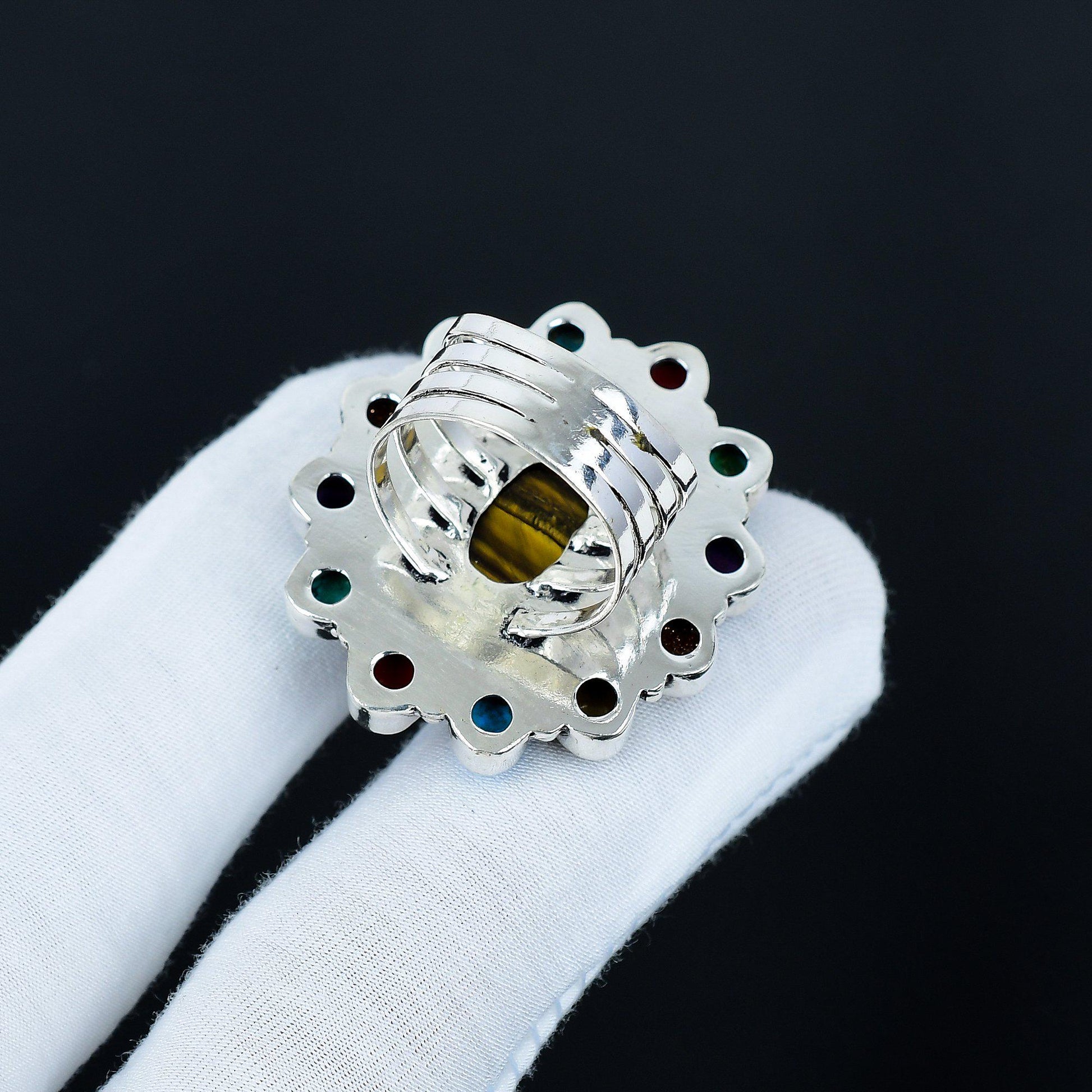 Design: The ring showcases a captivating central tiger's eye gemstone, surrounded by a colorful assortment of cabochon stones, including turquoise, red coral, and deep blue lapis lazuli, all meticulously arranged to create a bold yet harmonious look.