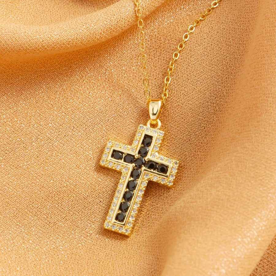 The finely crafted cross is suspended from a delicate gold chain, adding a touch of sophistication to any ensemble.