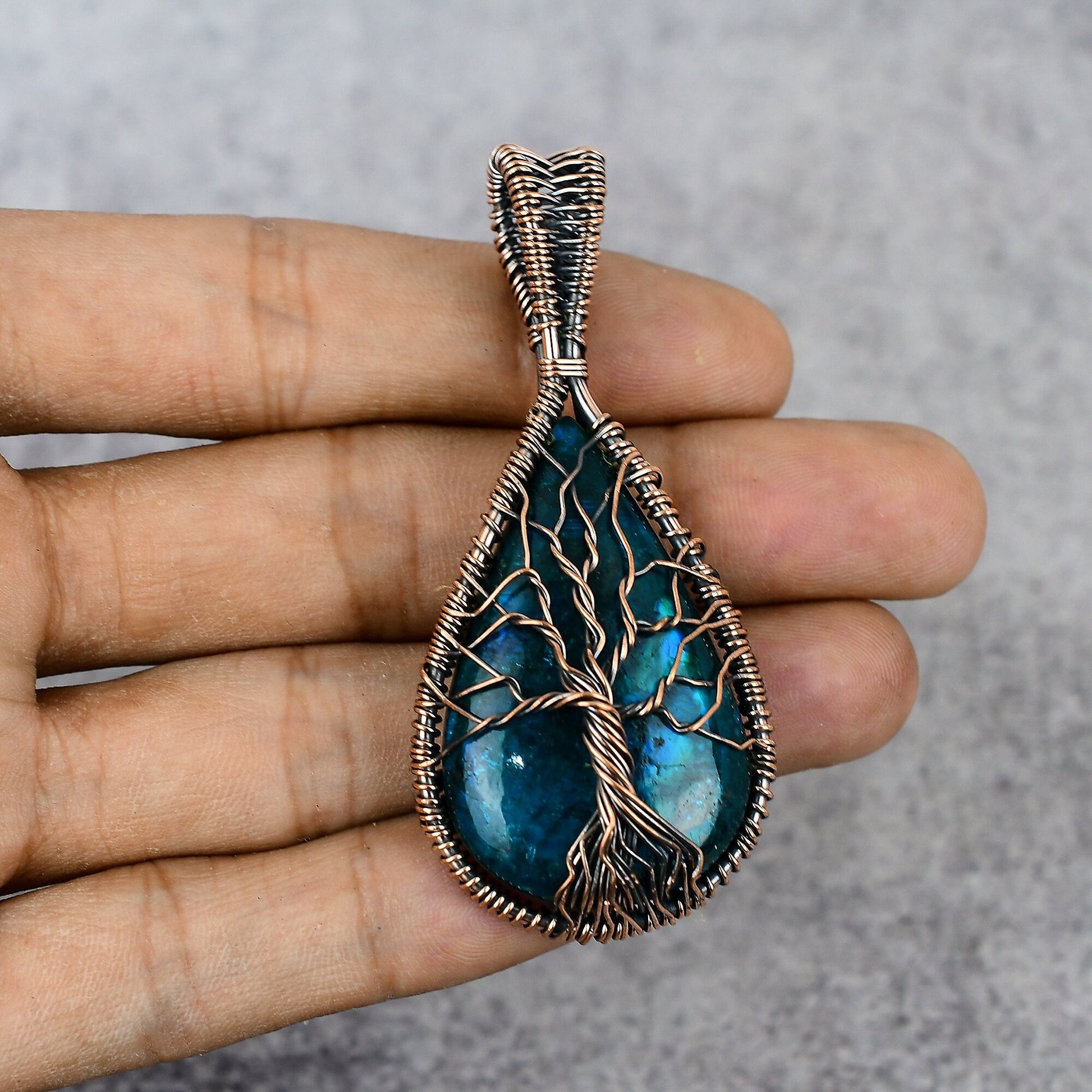 The deep blue and green hues of the stone reflect a serene beauty, reminiscent of nature's tranquility. The copper wire details gracefully form a tree, symbolizing growth and strength.