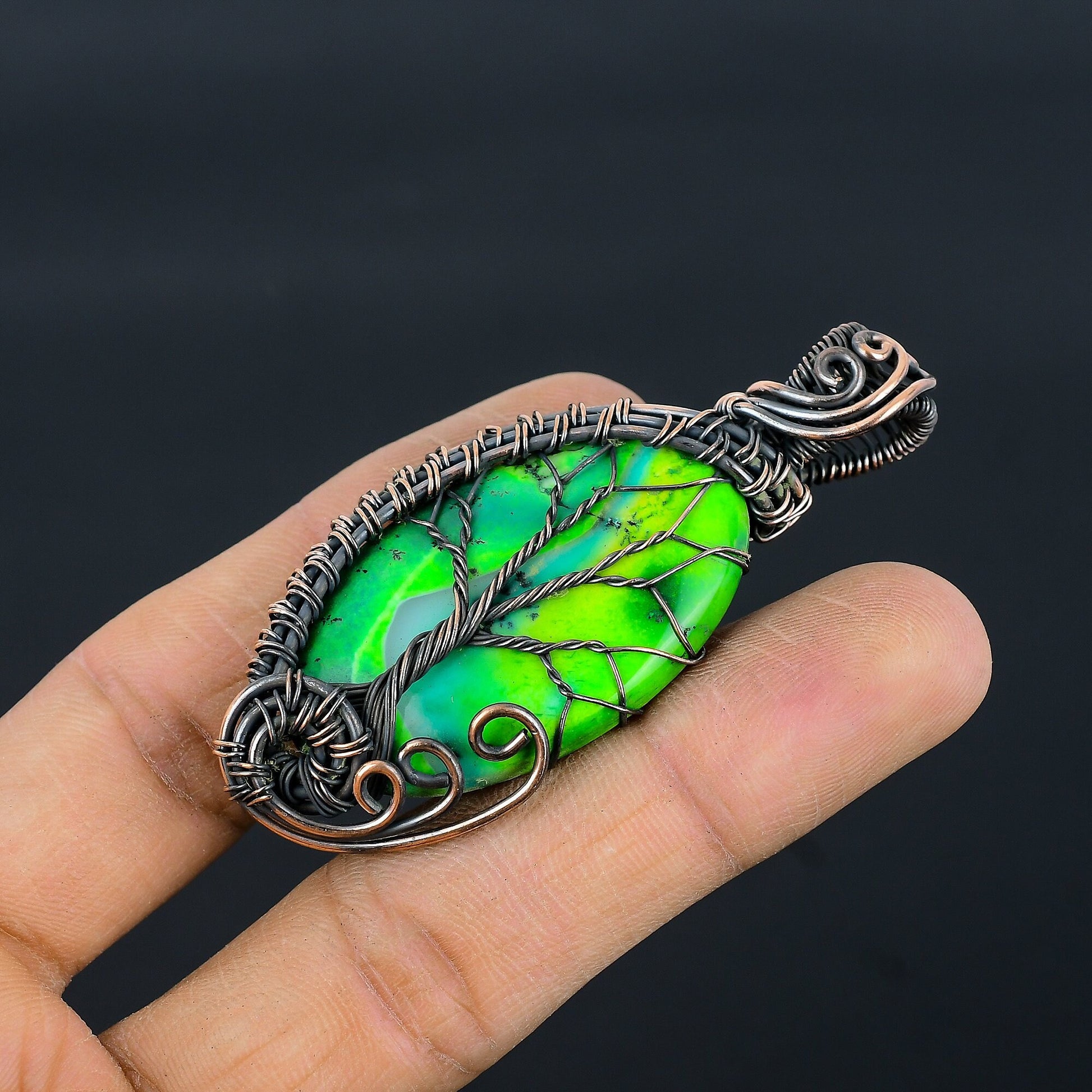 This unique piece features a vibrant, luminous green stone, framed intricately with wirework that mimics the delicate branches of a tree of life.