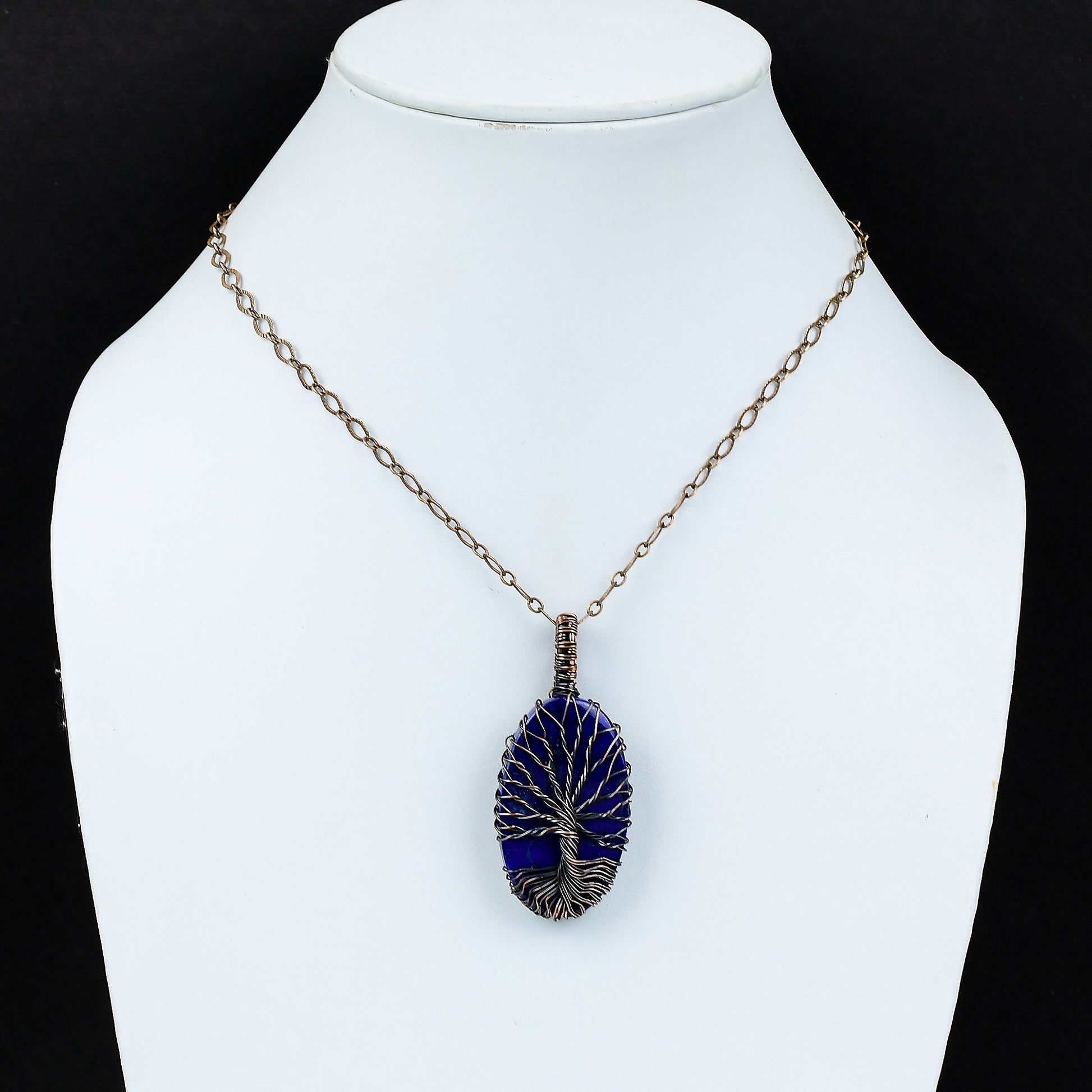 This stunning piece features a deep blue gemstone, expertly wrapped in copper wire to form a detailed tree of life design.
