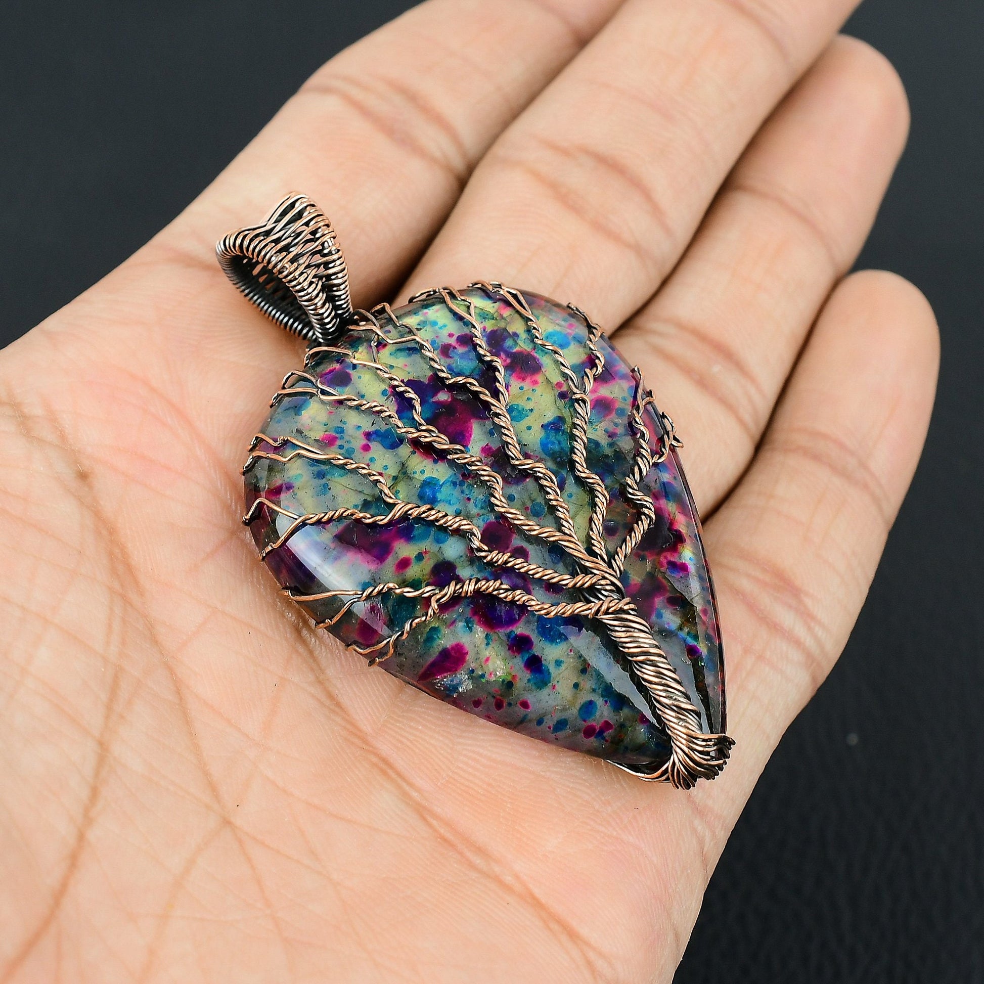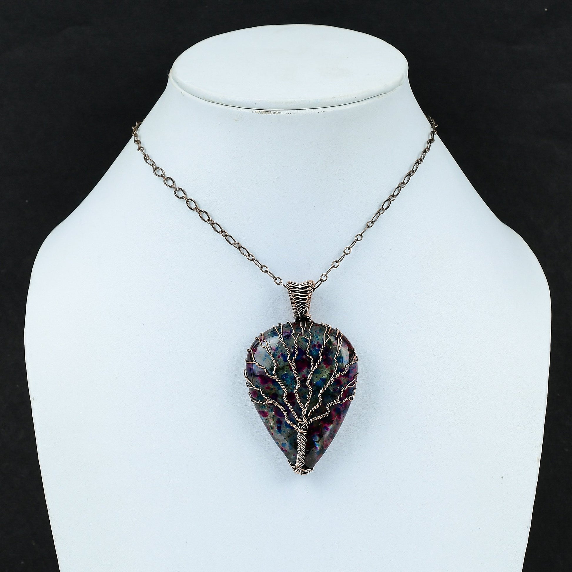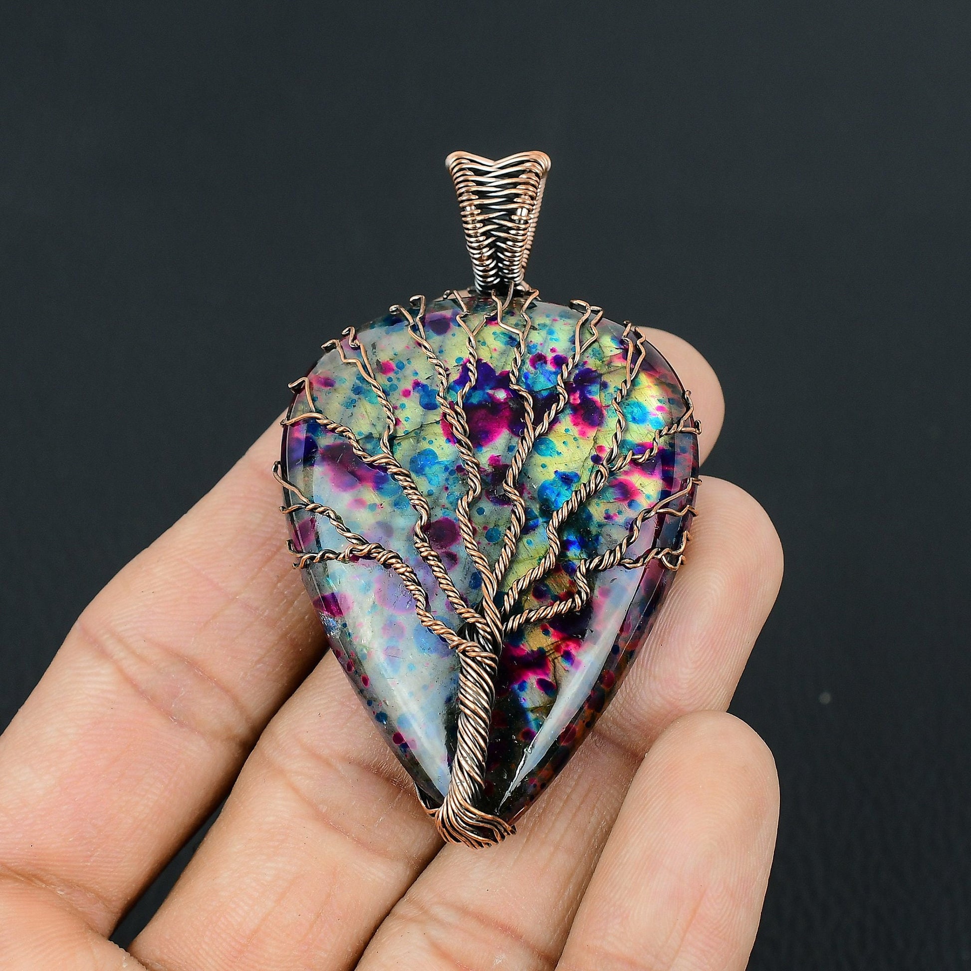 Intricately crafted with a colorful stone background, the pendant showcases a beautifully wire-wrapped tree design.