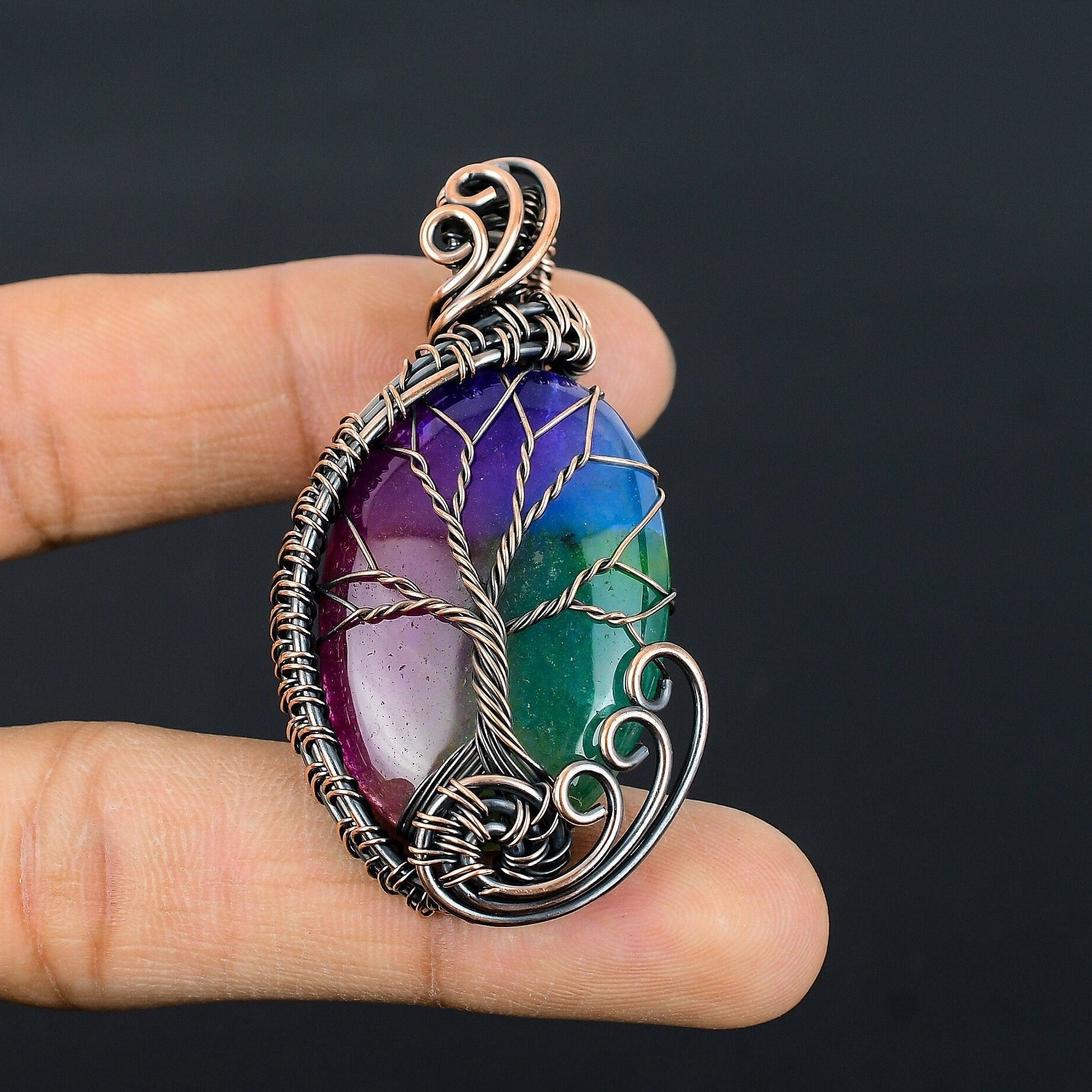 Embrace the beauty of nature with our handcrafted Tree of Life pendant. This exquisite piece of jewelry features a stunning combination of vibrant colors, capturing the essence of a serene forest. The intricate wirework beautifully frames the stone, symbolizing strength, growth, and connection to the earth.