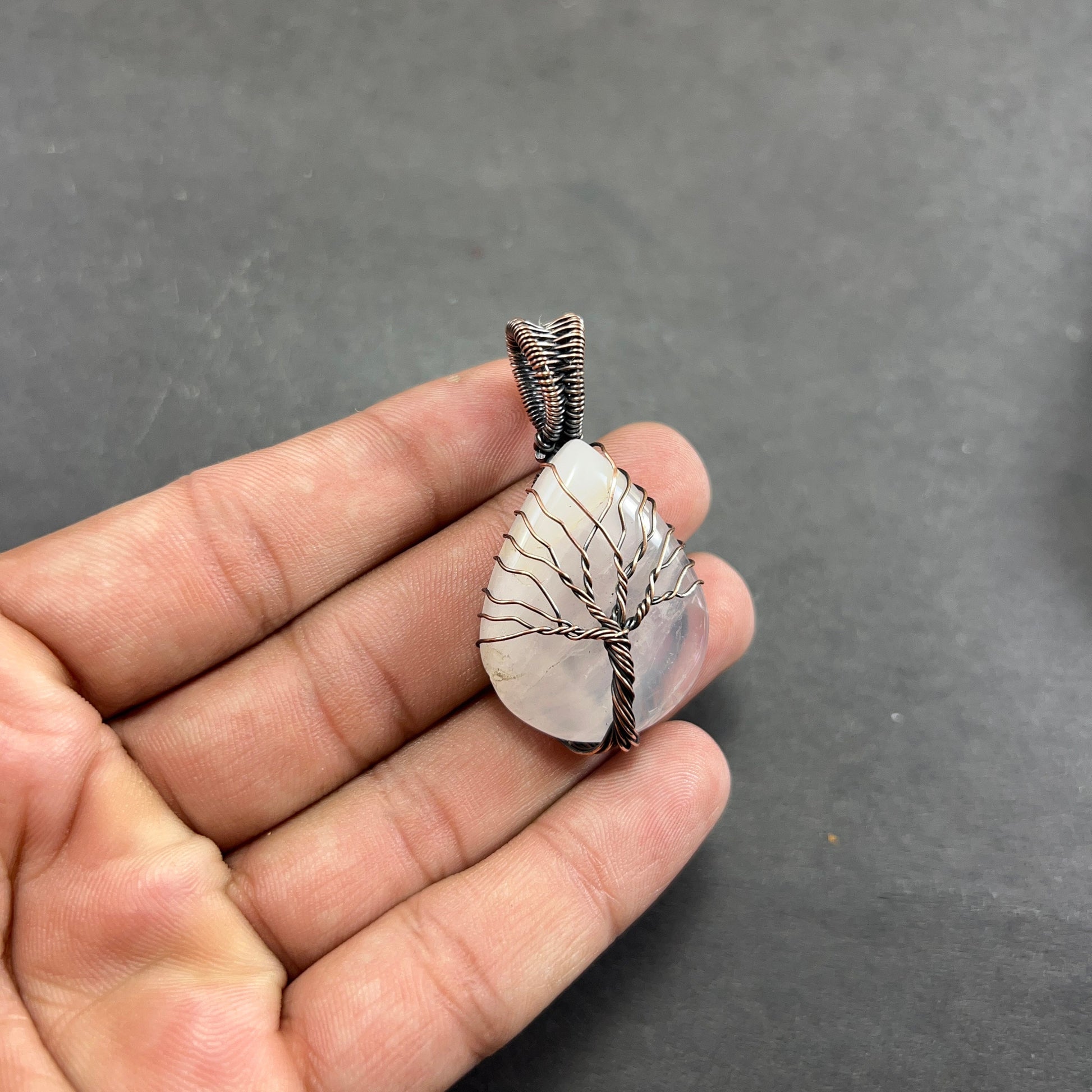 Features a stunning teardrop-shaped gemstone, delicately wrapped in copper wire, forming a majestic tree design.