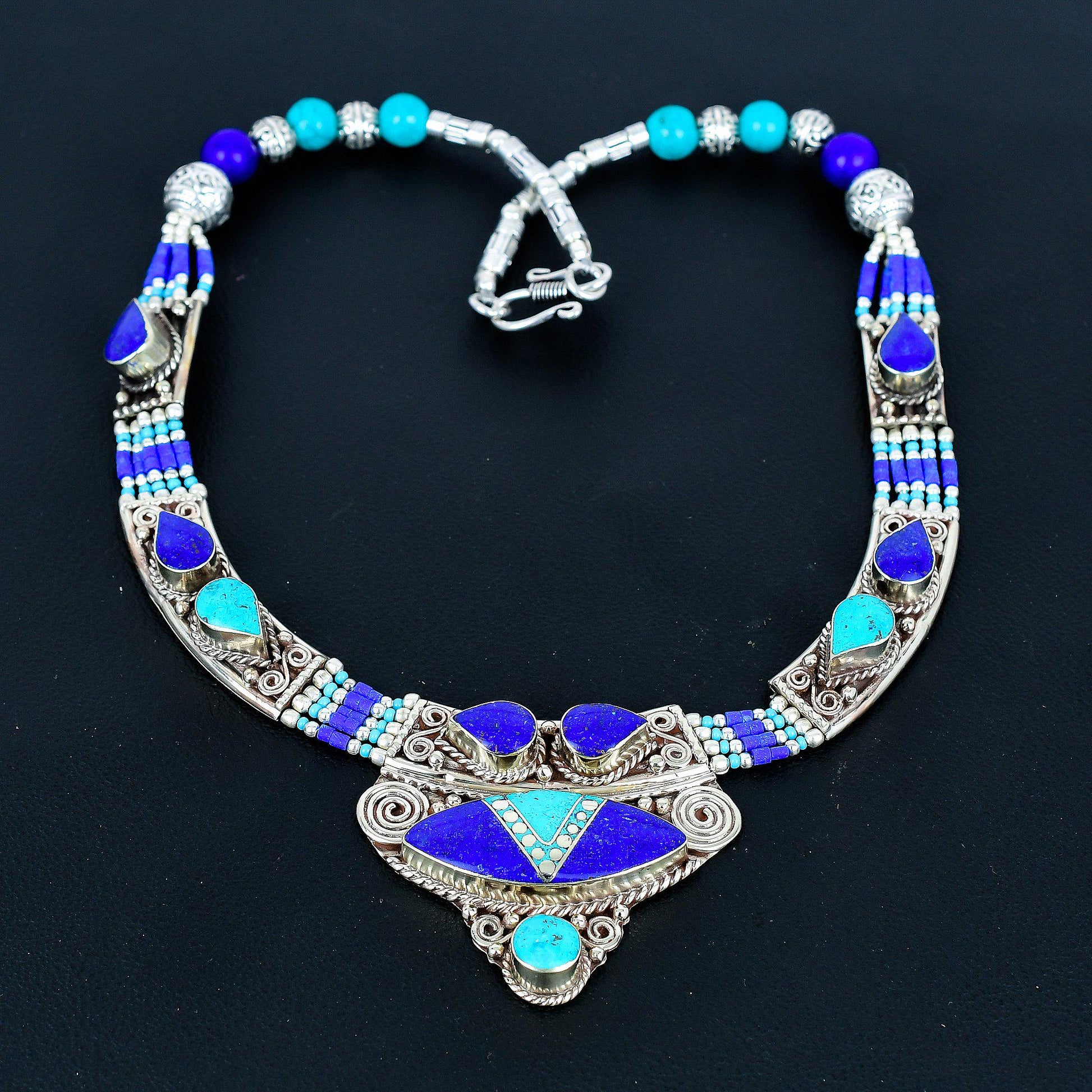 Featuring exquisite lapis lazuli and turquoise stones, this statement piece embraces a vibrant color palette, reflecting the serene beauty of nature.