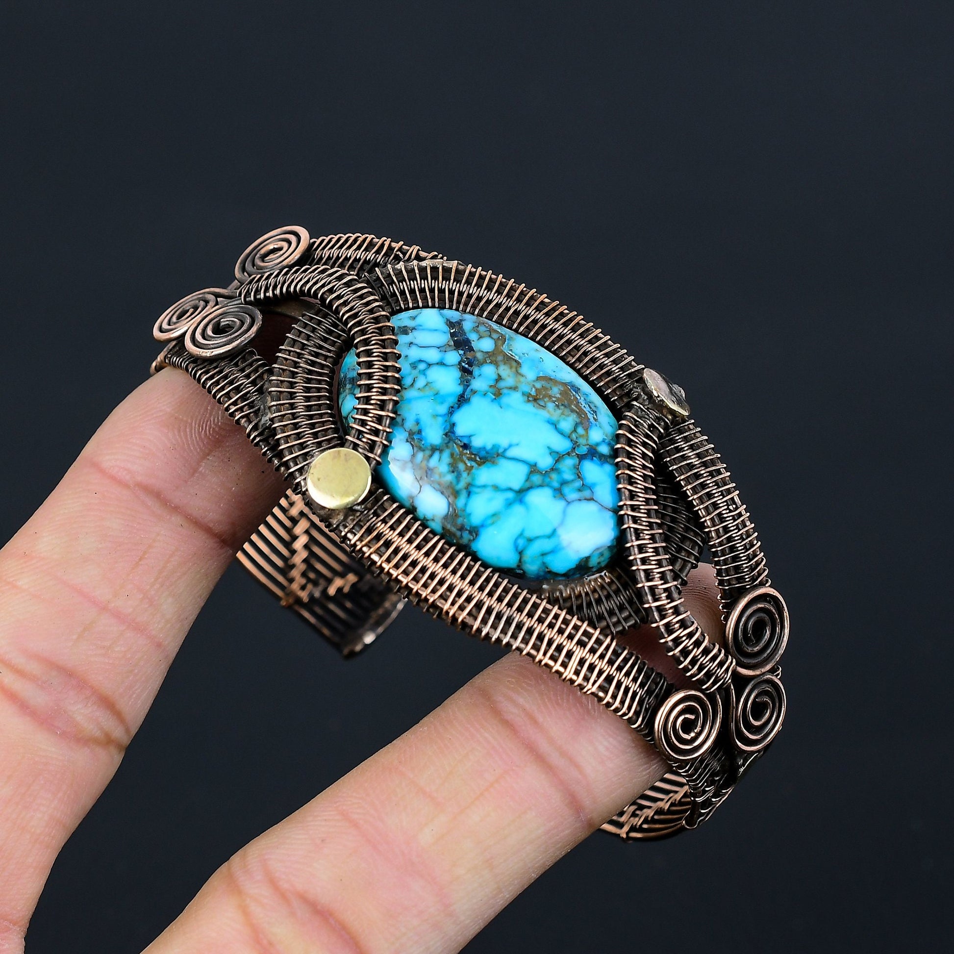 Embrace the elegance of natural beauty with our exquisite wire-wrapped copper bracelet, featuring a stunning turquoise stone at its heart. Each intricate swirl and loop is hand-worked to perfection, weaving together the warmth of copper with the vibrant hue of turquoise. This bracelet is not just an accessory, but a statement piece that speaks of artisanal craftsmanship and timeless style.