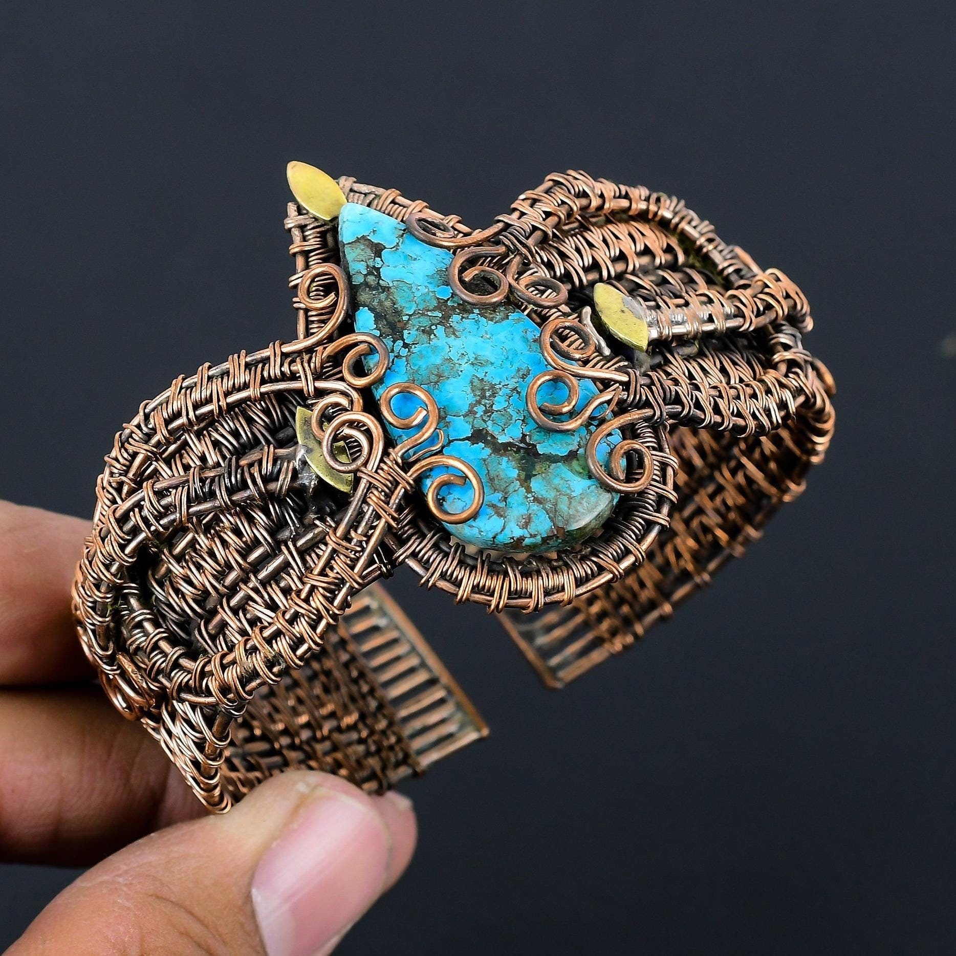 Experience the allure of timeless craftsmanship with our Handcrafted Copper and Turquoise Bracelet. This exquisite piece features a stunning turquoise gemstone artfully woven into intricate copper wirework, creating a unique statement accessory.