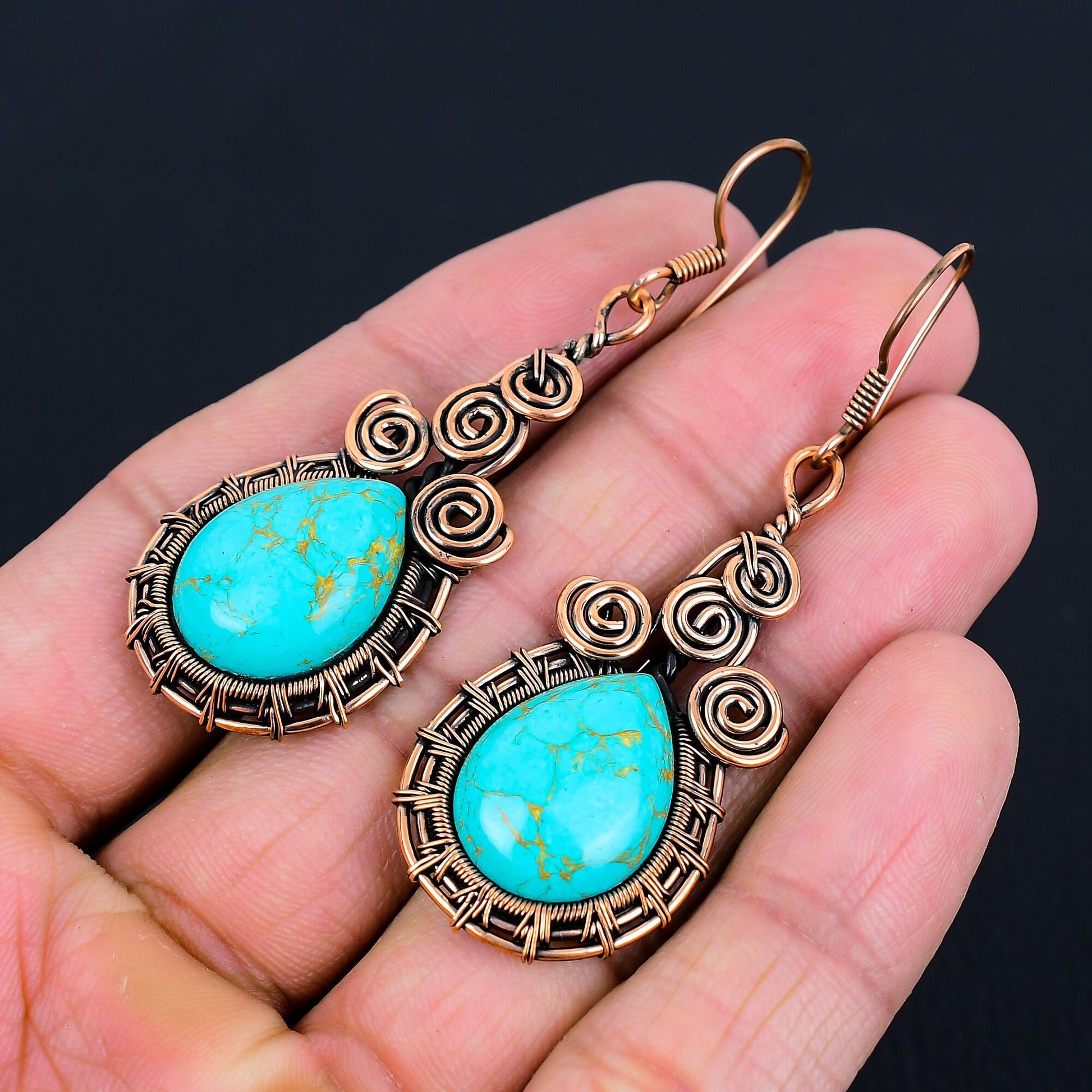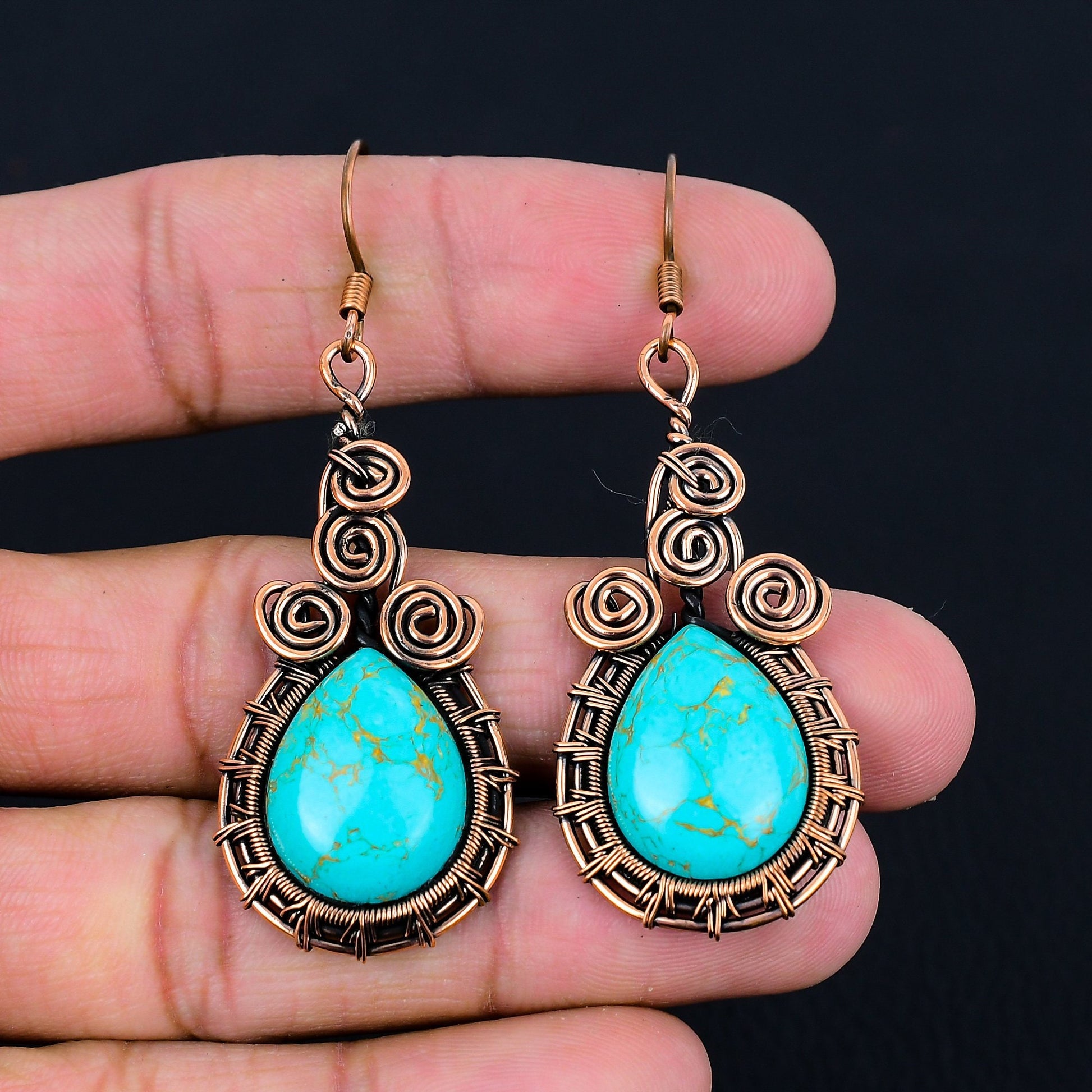 Immerse yourself in elegance with our handcrafted turquoise drop earrings. These exquisite pieces feature vibrant turquoise stones, nestled in intricately woven copper wire, designed to capture the beauty of artisanal craftsmanship.