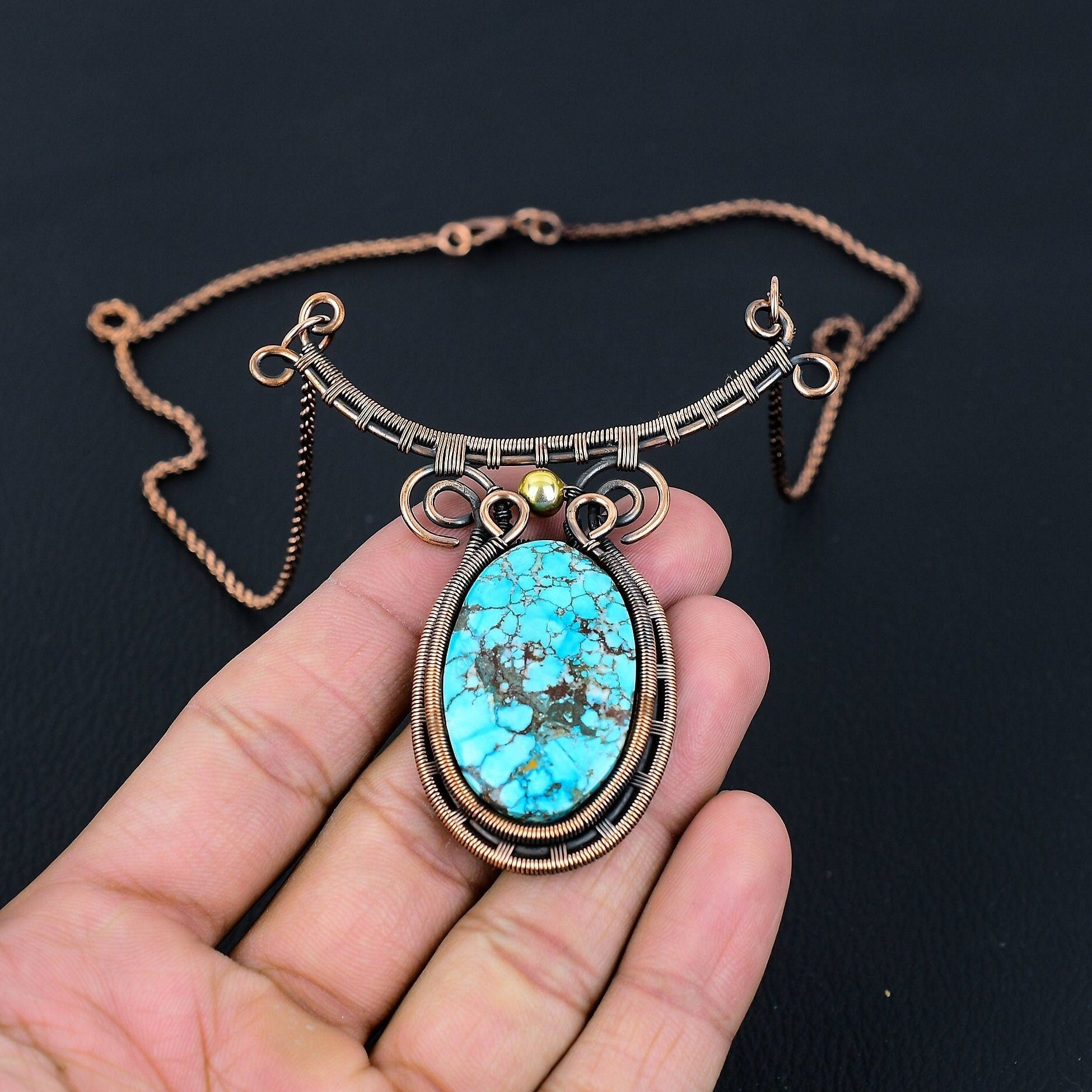 Elevate your style with this exquisite handcrafted necklace, featuring a stunning turquoise center stone set against an intricately designed copper wire frame.
