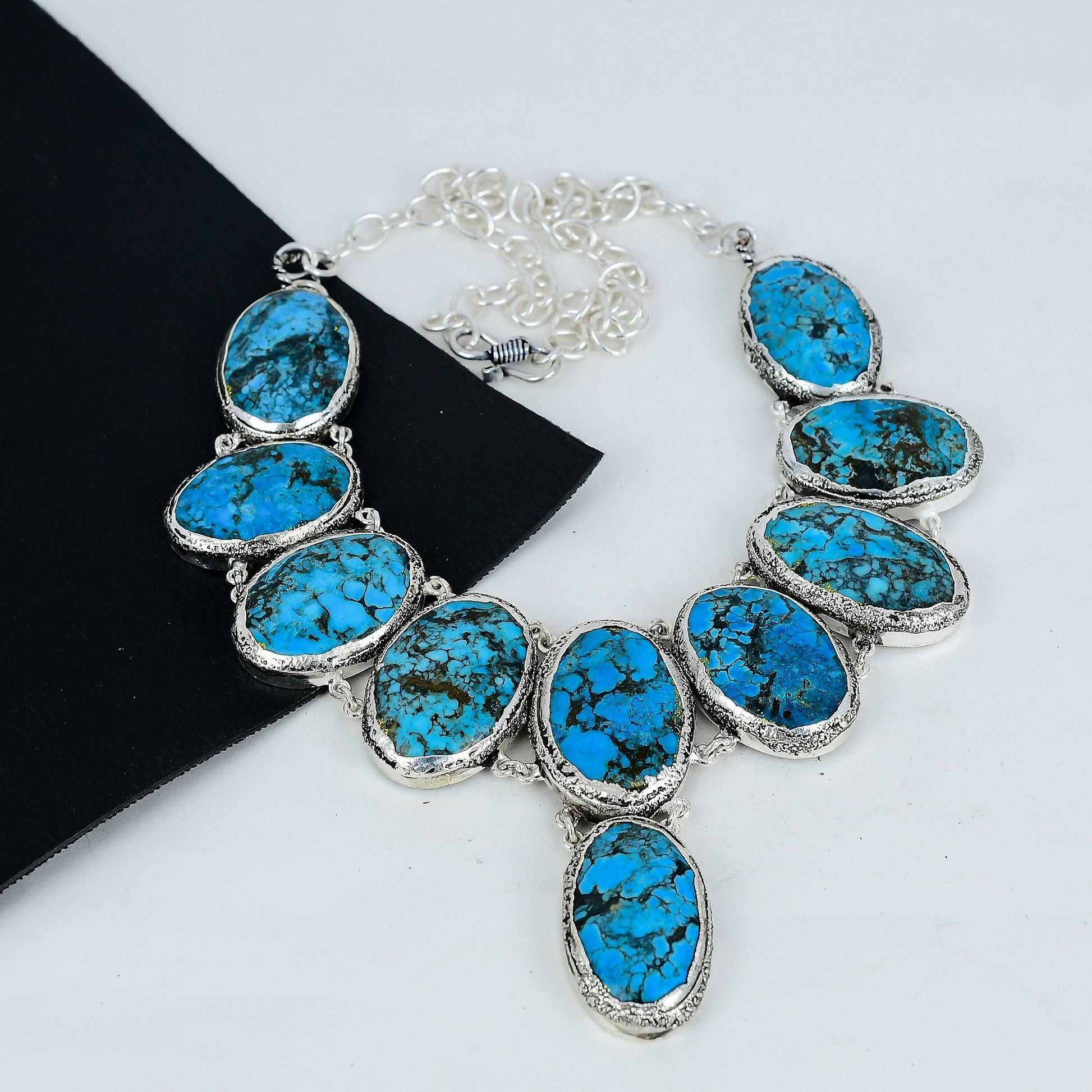 The necklace features vibrant turquoise stones, each uniquely patterned, set in detailed silver bezels that add a touch of sophistication.