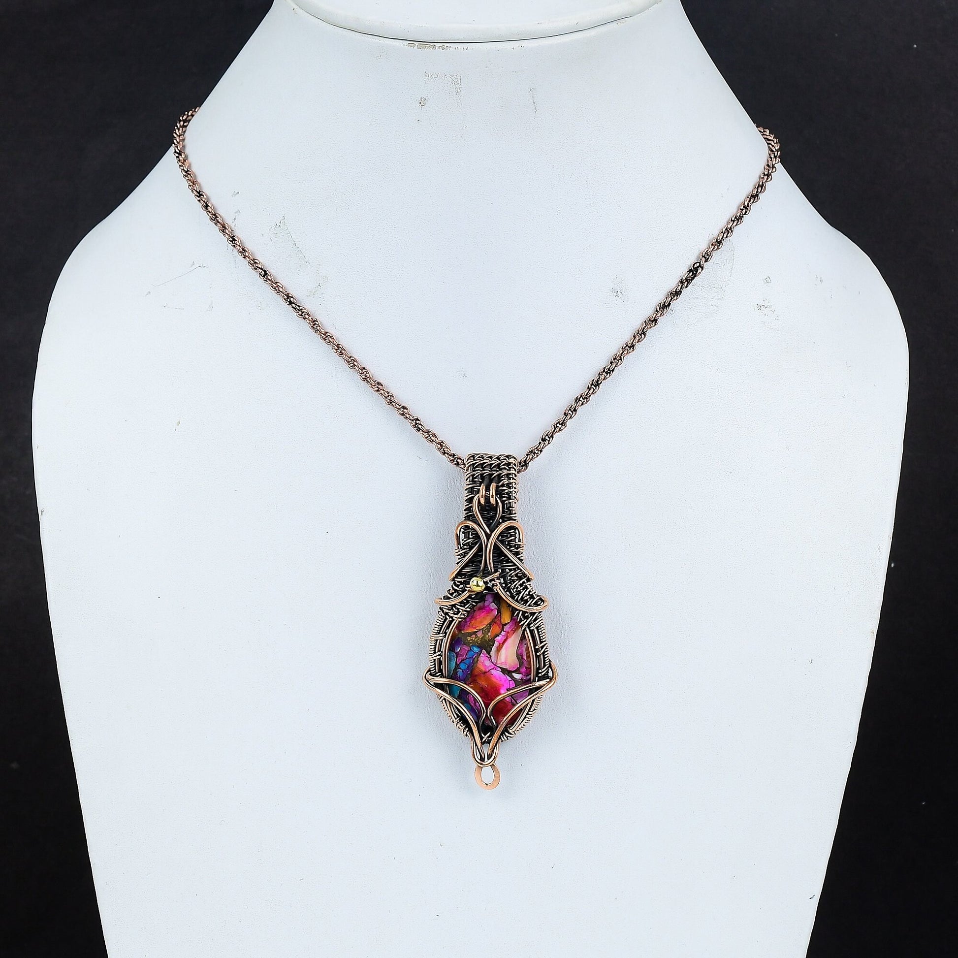 Meticulously wrapped in fine copper wire, the pendant showcases an exquisite rainbow-colored stone, blending an array of captivating hues.