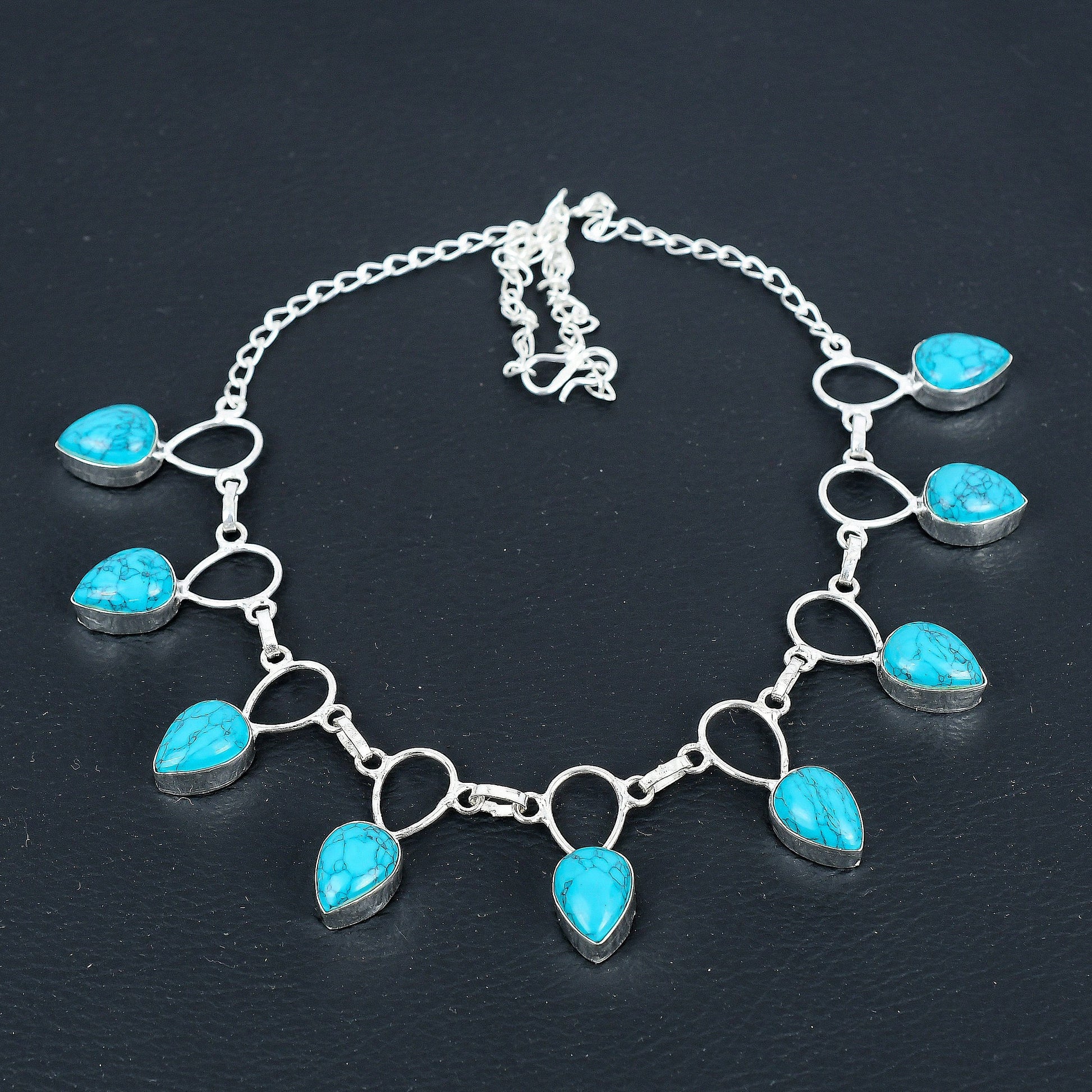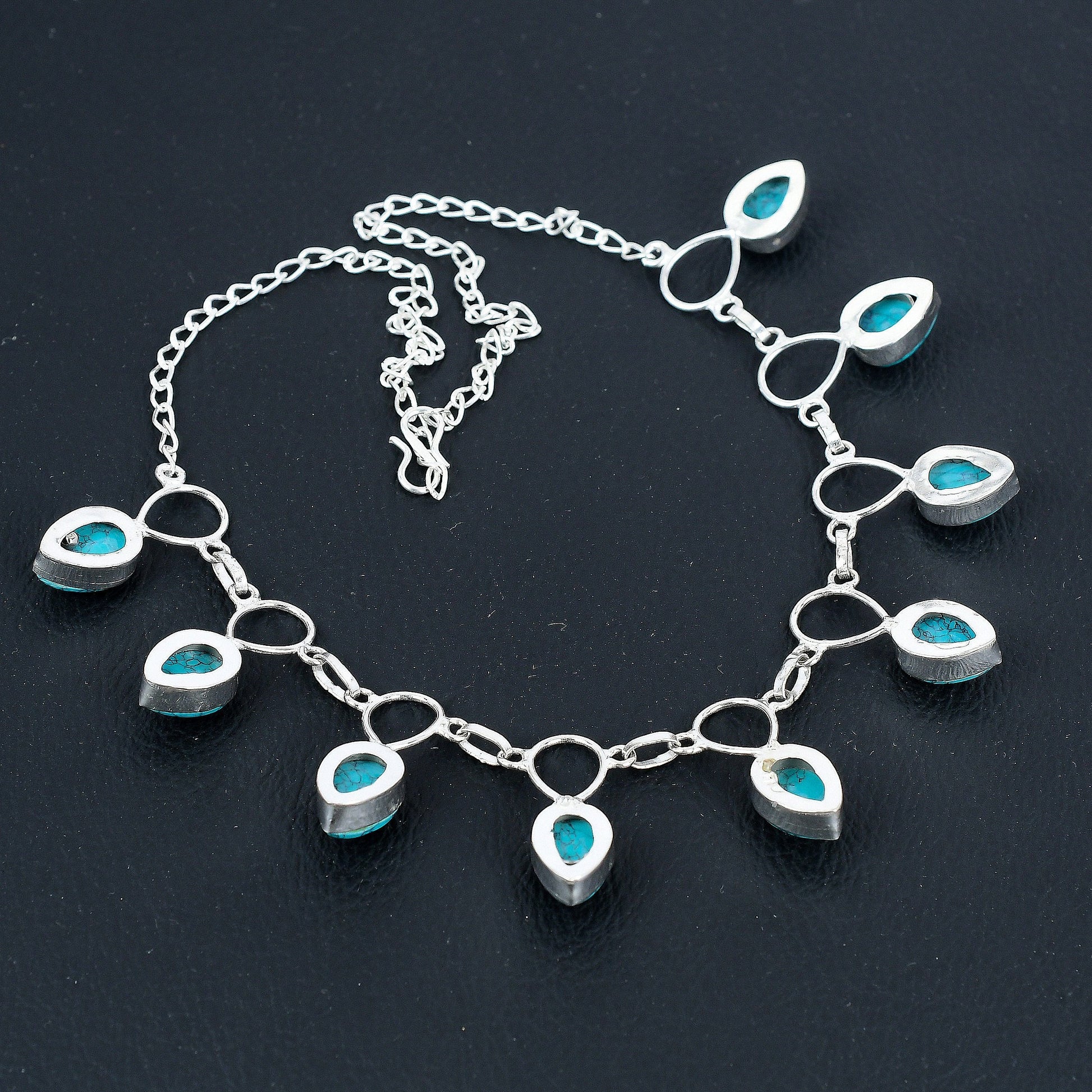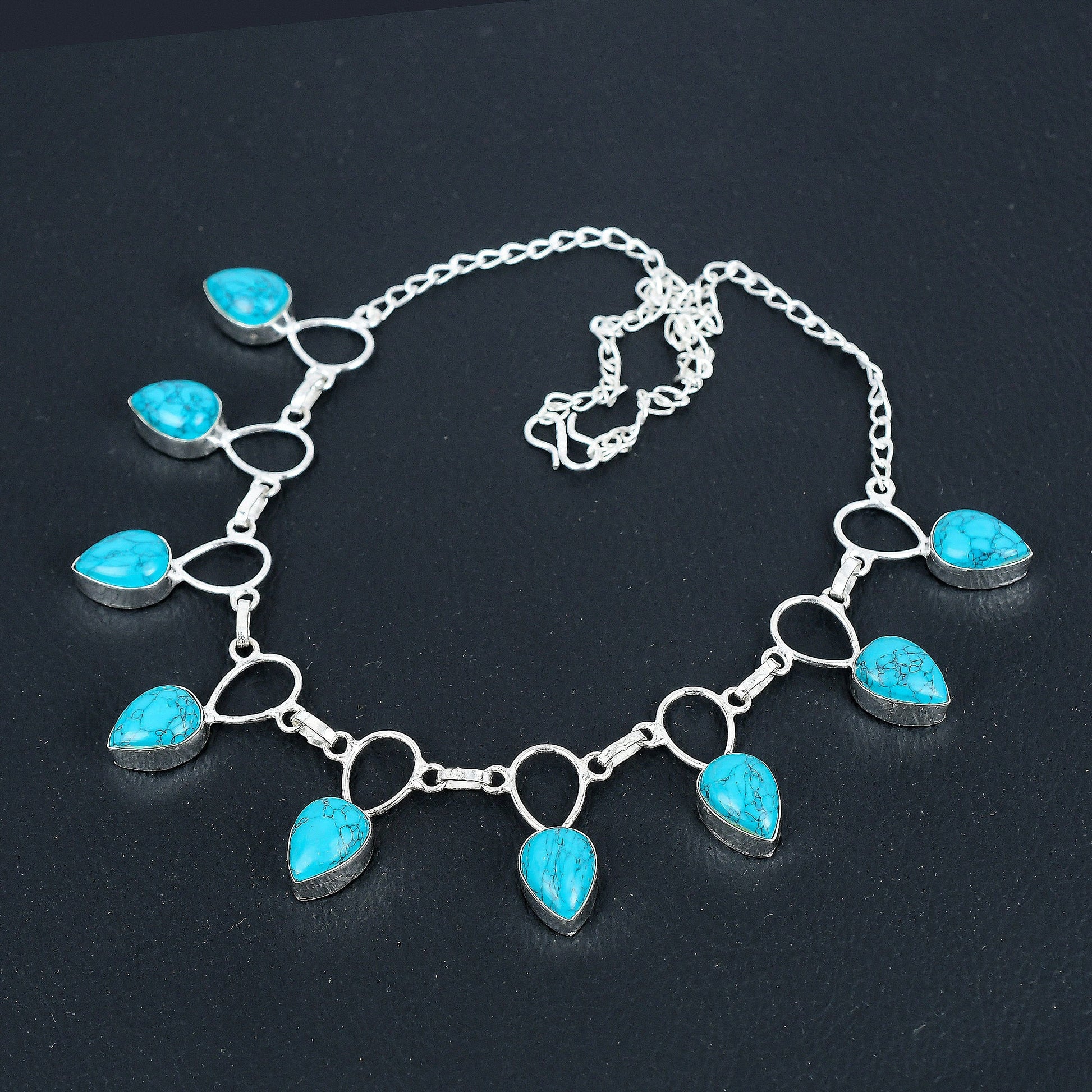Introducing our exquisite Teardrop Turquoise Necklace, a stunning statement piece that exudes elegance and artistry. Crafted meticulously with pear-shaped turquoise stones set in a delicate silver chain, this necklace embodies a perfect blend of style and sophistication.