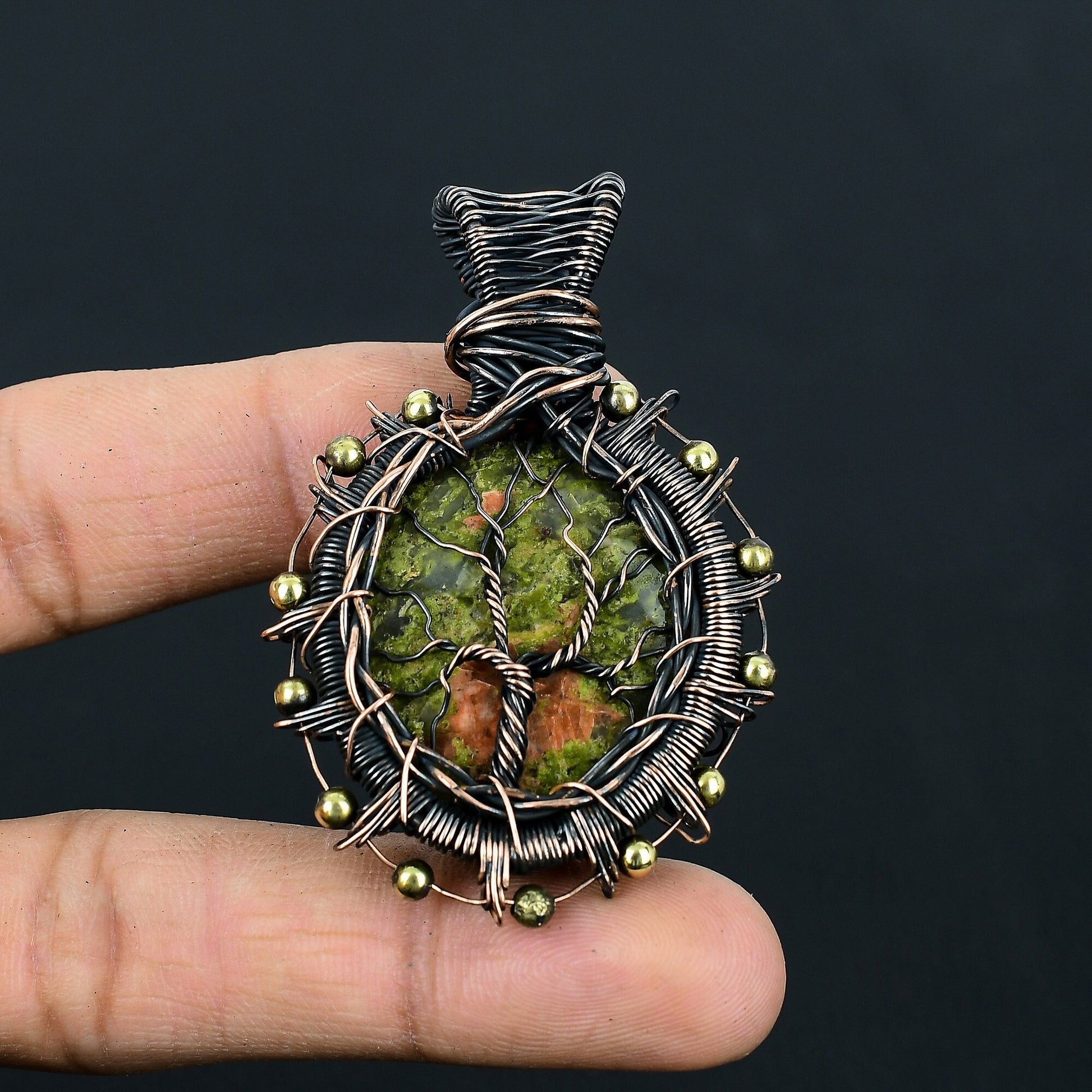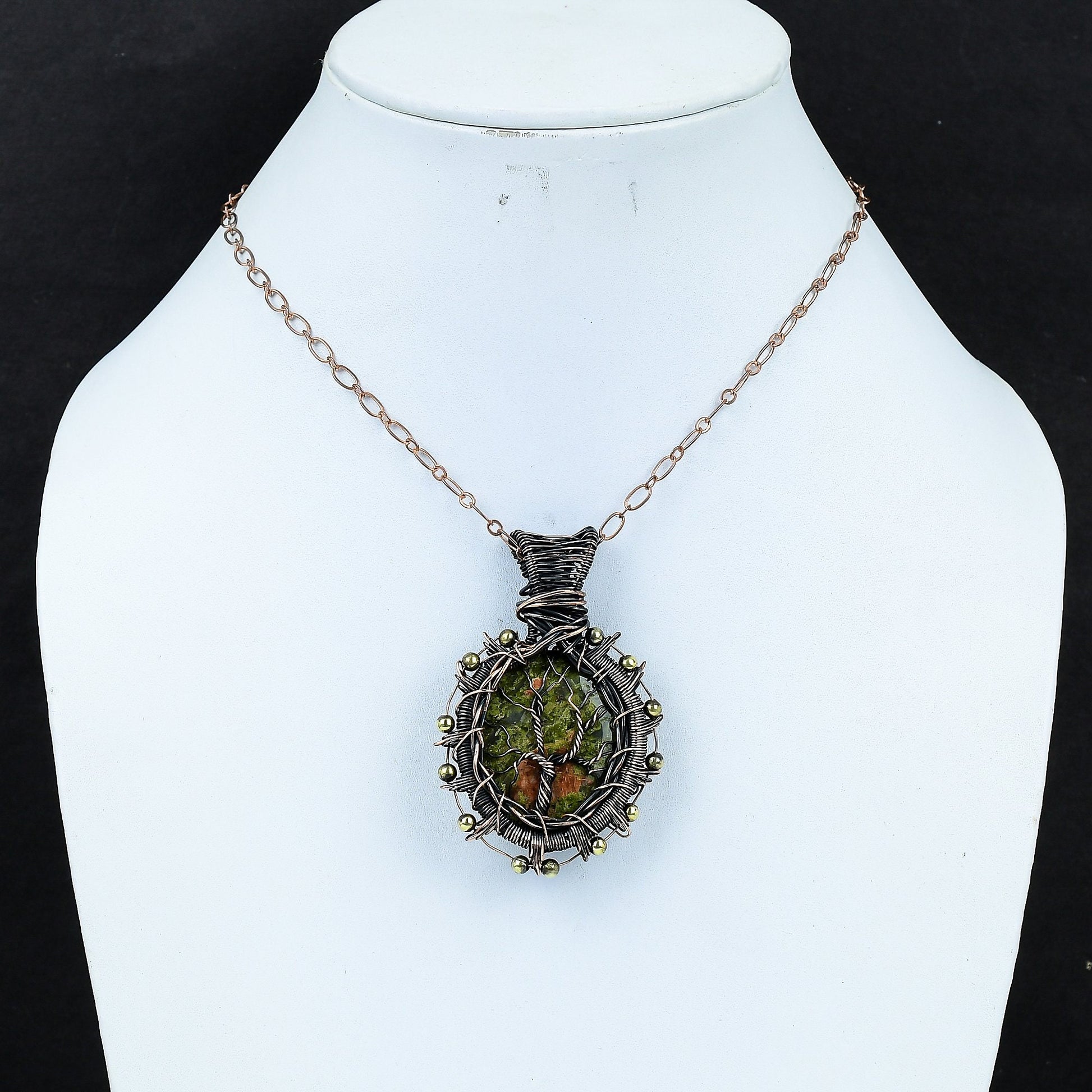 This handcrafted piece features a stunning tree design, meticulously crafted with intricate wire weaving that exudes elegance and sophistication. The pendant's vivid green and earthy tones create a harmonious blend, reminiscent of an ancient forest.