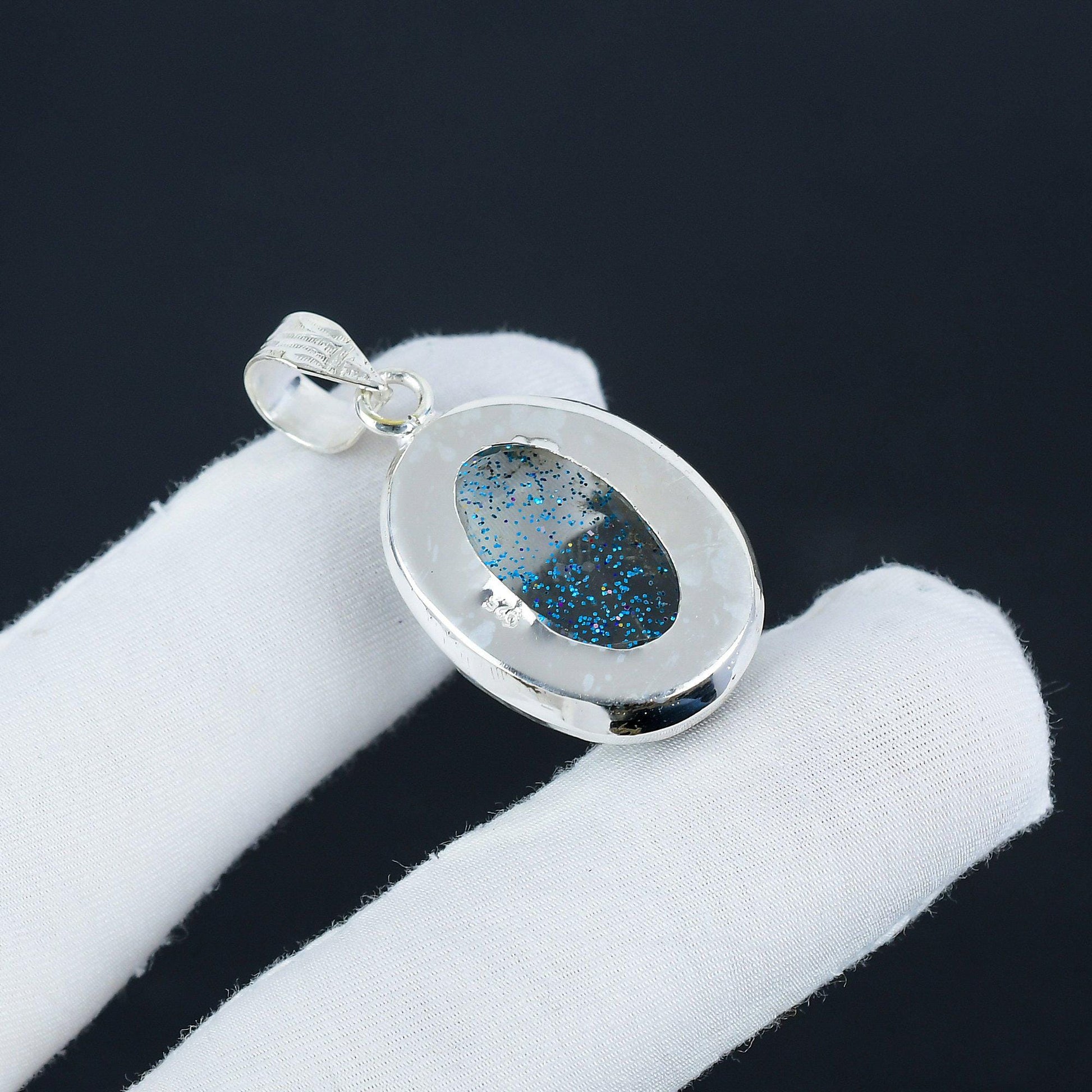 This exquisite pendant features a stunning oval-shaped stone, encapsulating a universe of dazzling blue specks, reminiscent of a galaxy far away. The stone is encased in premium quality silver, adding a touch of sophistication to this celestial beauty.
