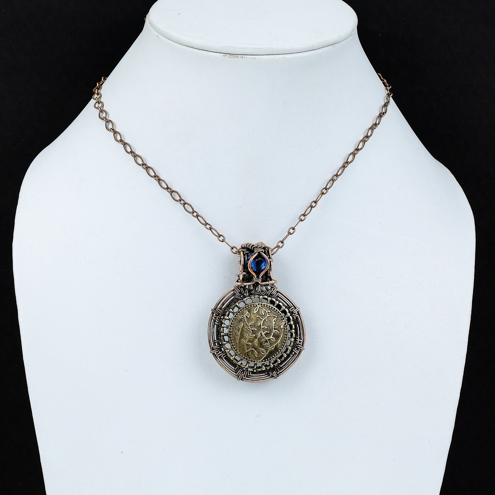 Encased in a meticulous wire-wrapped design, the pendant radiates a rustic charm, enhanced by a striking blue gemstone, adding a touch of sophistication.