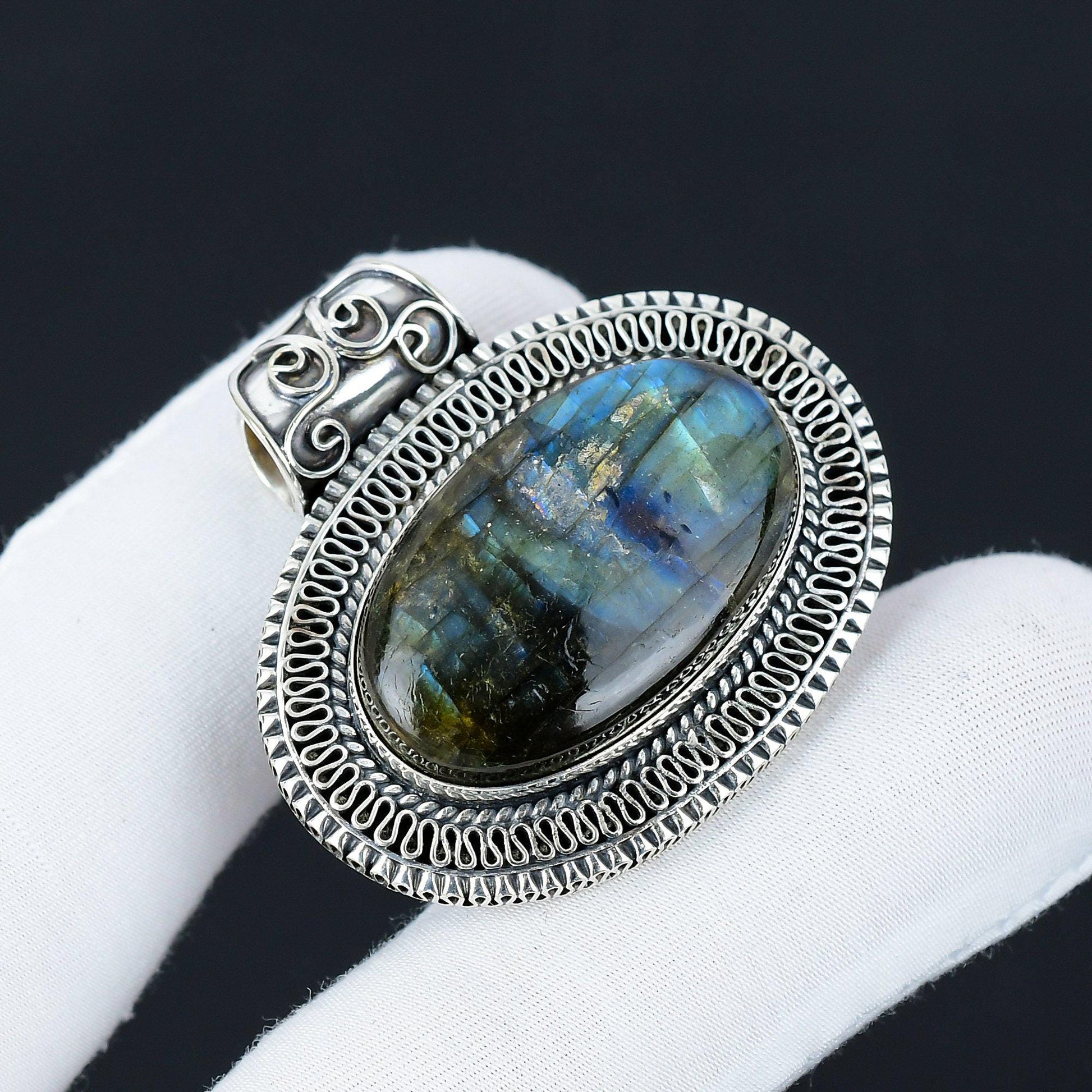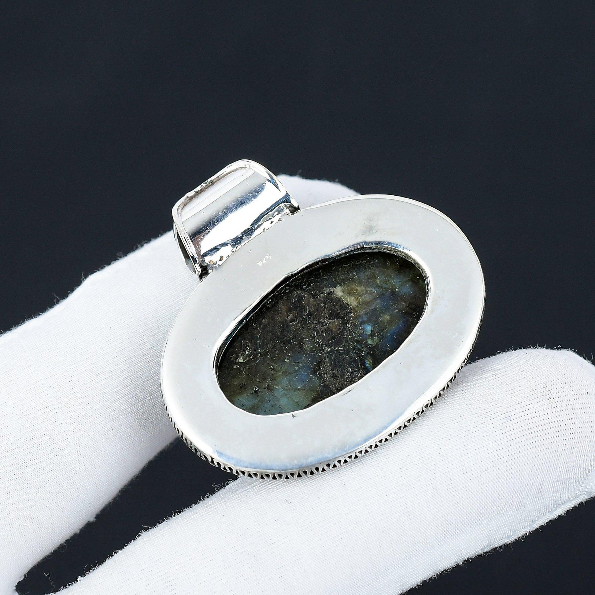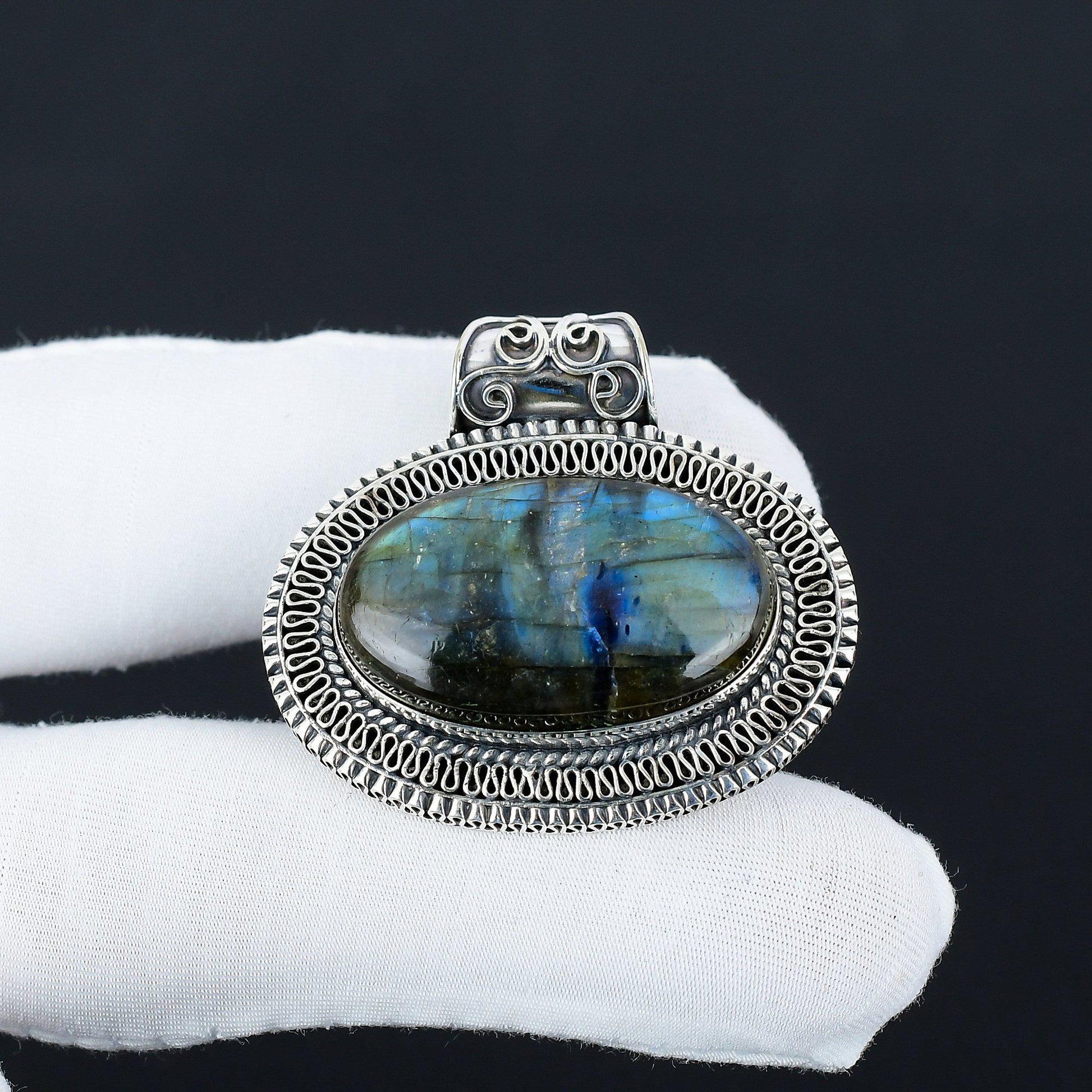 This uniquely designed silver pendant features a stunning oval labradorite gemstone, encased in an intricately detailed setting that showcases expert craftsmanship.