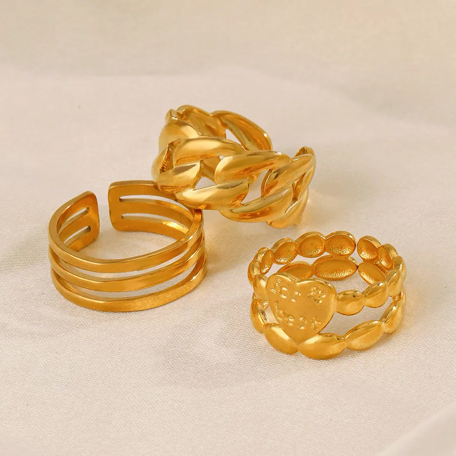 - Design: Features three unique styles, including a braided band, a cut-out stripe ring, and a heart-detailed band.