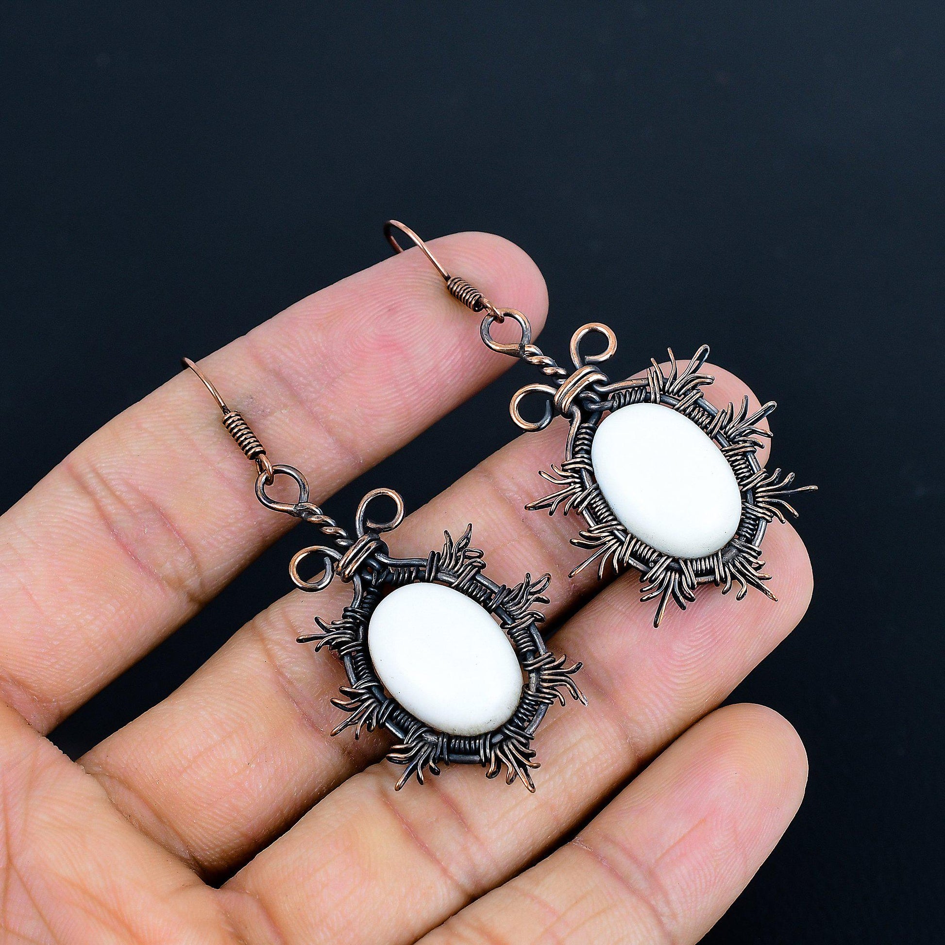Discover the exquisite charm of our handcrafted copper wire earrings, featuring a stunning white oval stone at the center.