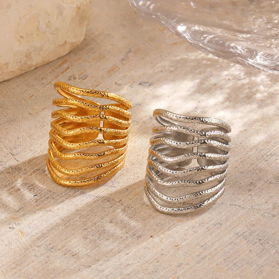 Design: Inspired by the natural flow of ocean waves, these rings feature delicate curves that effortlessly capture light and movement. Available in both striking gold and sophisticated silver finishes, their intricate detailing adds a touch of sophistication to any ensemble.