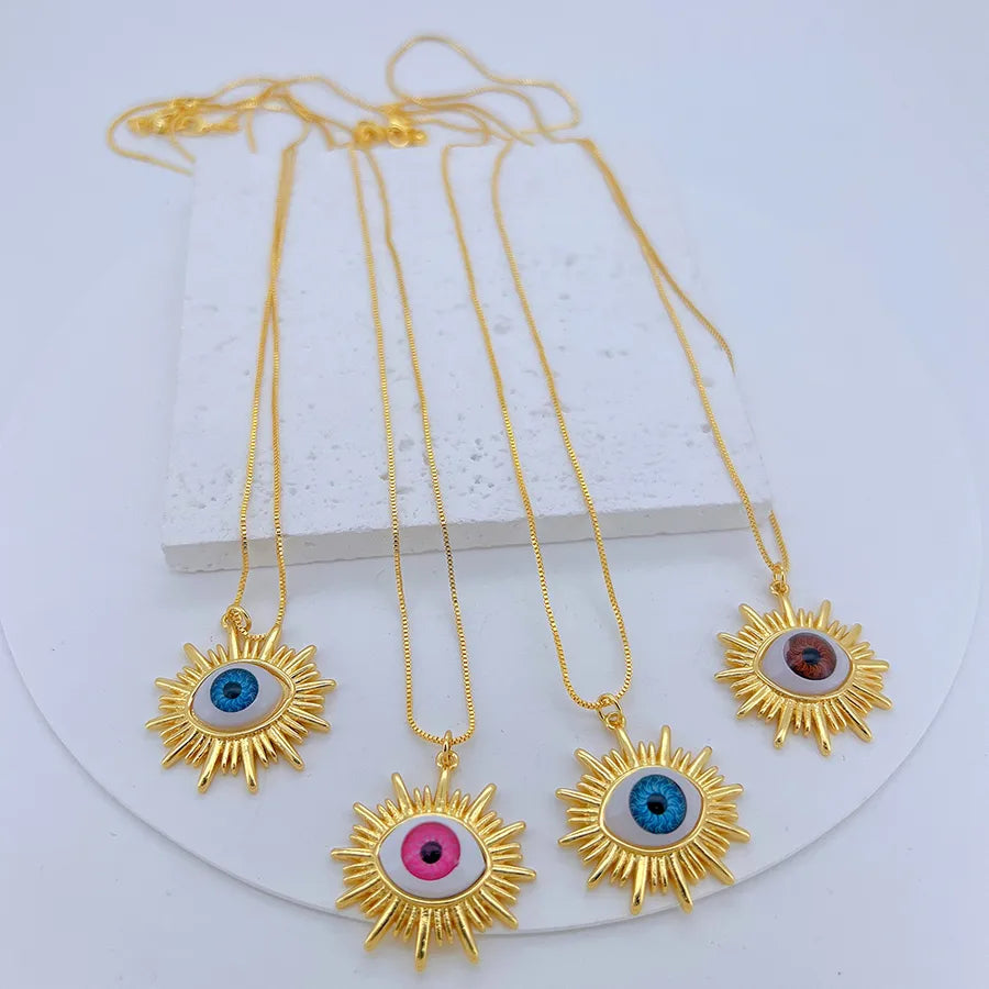 Crafted with precision, each necklace features a captivating eye design, surrounded by radiant golden sunbeams, symbolizing protection and insight.