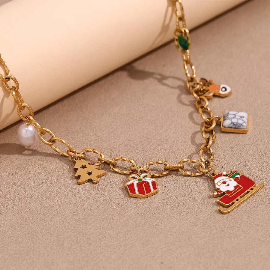 This delightful piece features a series of intricately designed charms, including a Christmas tree, a gift box, and a cheerful Santa, all suspended on a durable gold-toned chain.
