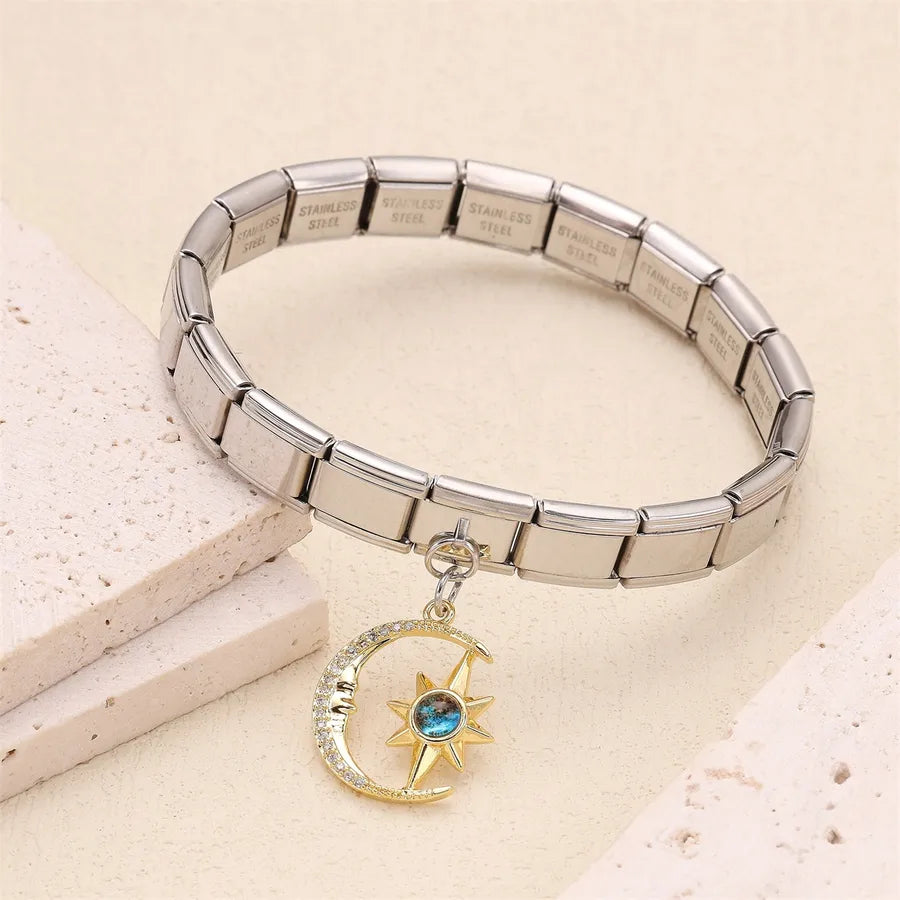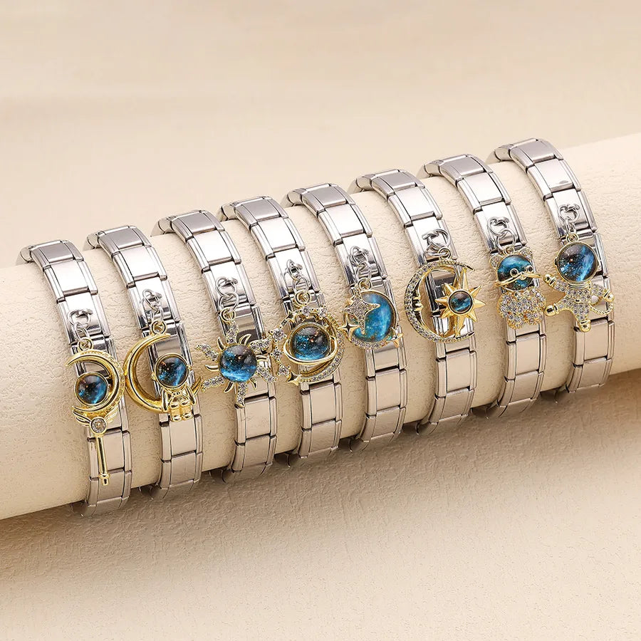 Elevate your style with our exquisite celestial-themed bracelets, crafted from high-quality stainless steel. Each piece in this collection features a unique charm that captures the mysteries of the universe, beautifully adorned with shimmering blue accents.