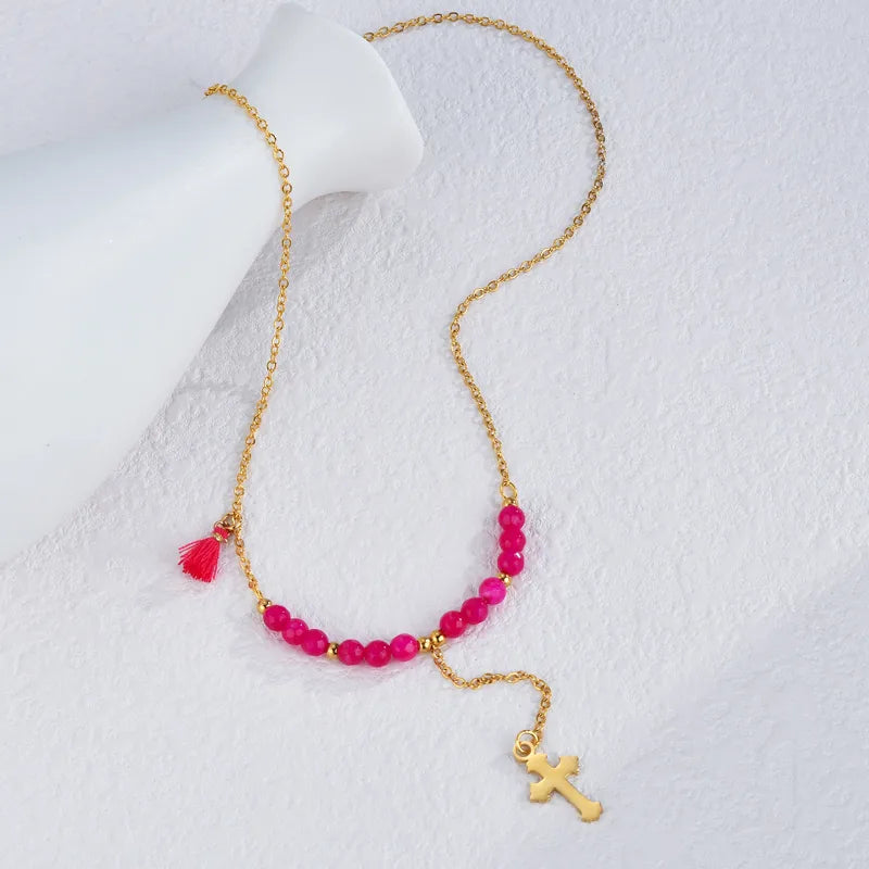 Featuring finely crafted cross pendants suspended from a delicate gold-plated chain, each necklace is adorned with vibrant, multi-colored beads. Choose from an elegant array of green, gray, black, or pink beads to suit any occasion.