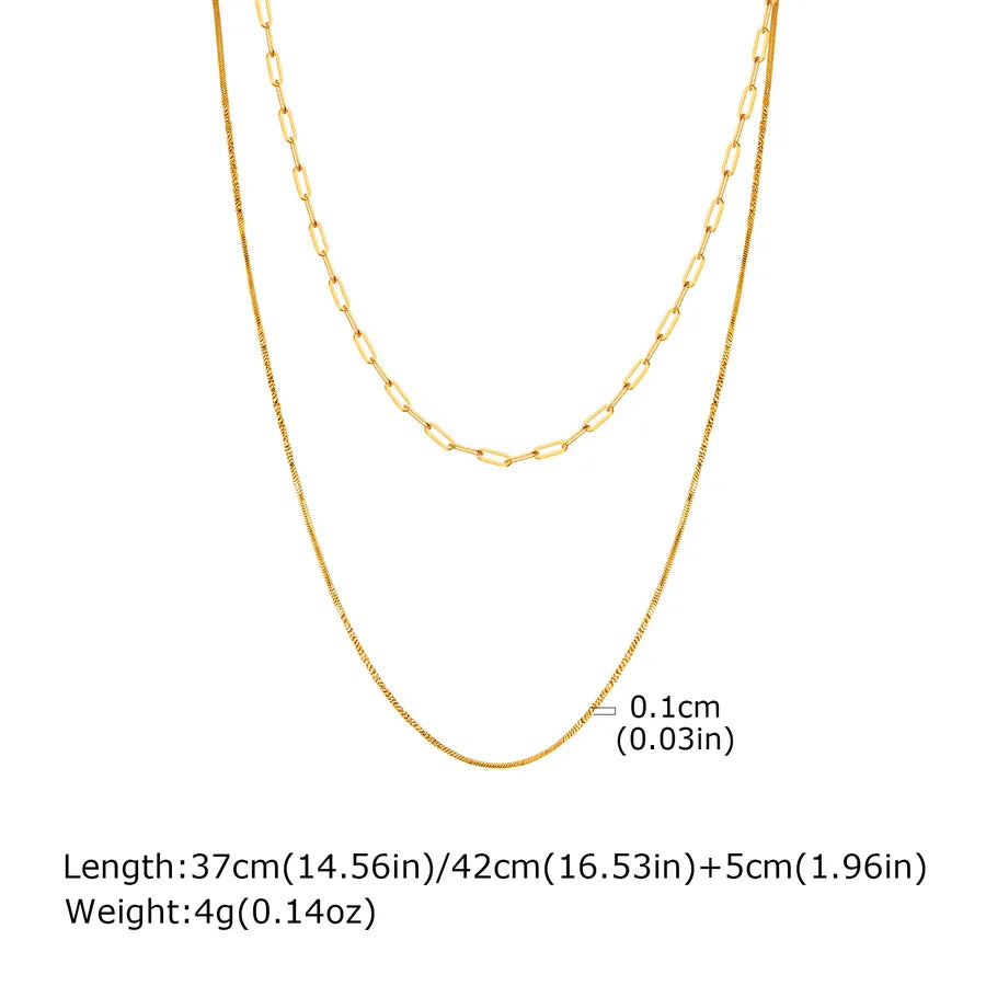 The first layer features a delicate chain, while the second showcases a bold, elongated link design, adding a touch of modern flair.