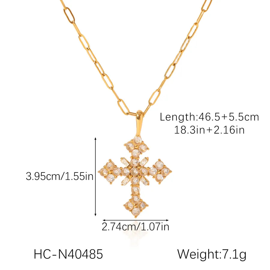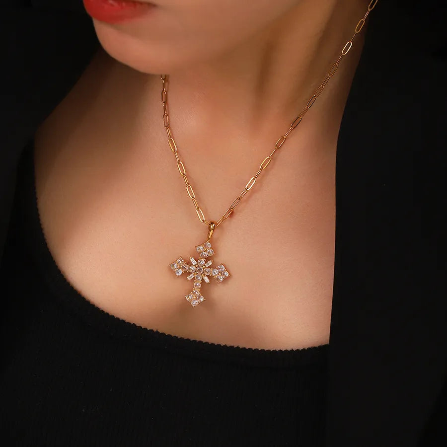 Elevate your style with this exquisite cross pendant necklace, featuring a stunning arrangement of shimmering crystals that catch the light beautifully.