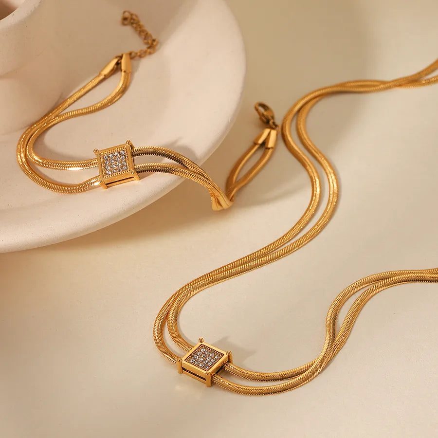 The striking square pendant is meticulously inlaid with sparkling stones, offering a touch of glamour and sophistication.