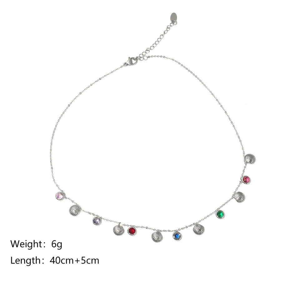 - Silver chain adorned with vibrant, colorful gemstones and delicate shell charms.