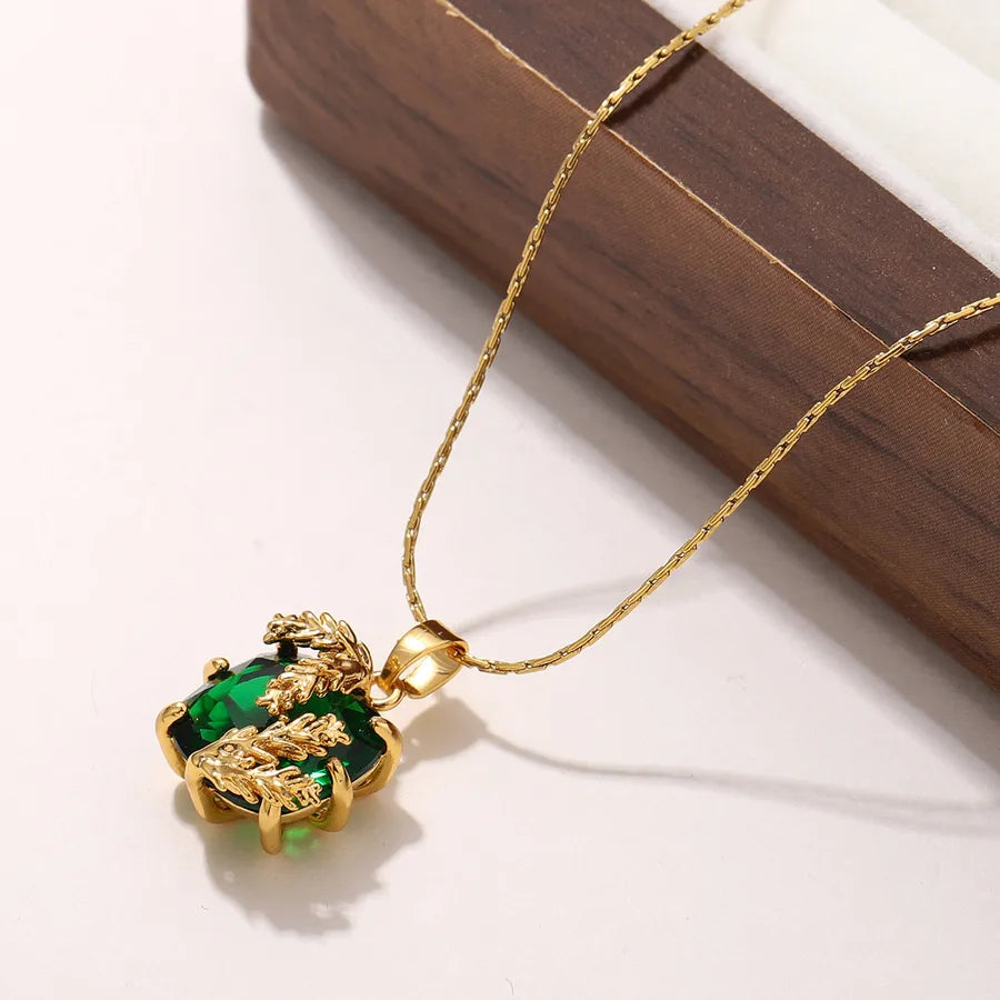 Featuring a vibrant emerald-green stone encased in a luxurious gold leaf design, this necklace offers a perfect blend of elegance and sophistication. The intricate detailing of the leaves adds a touch of nature-inspired beauty to your look.