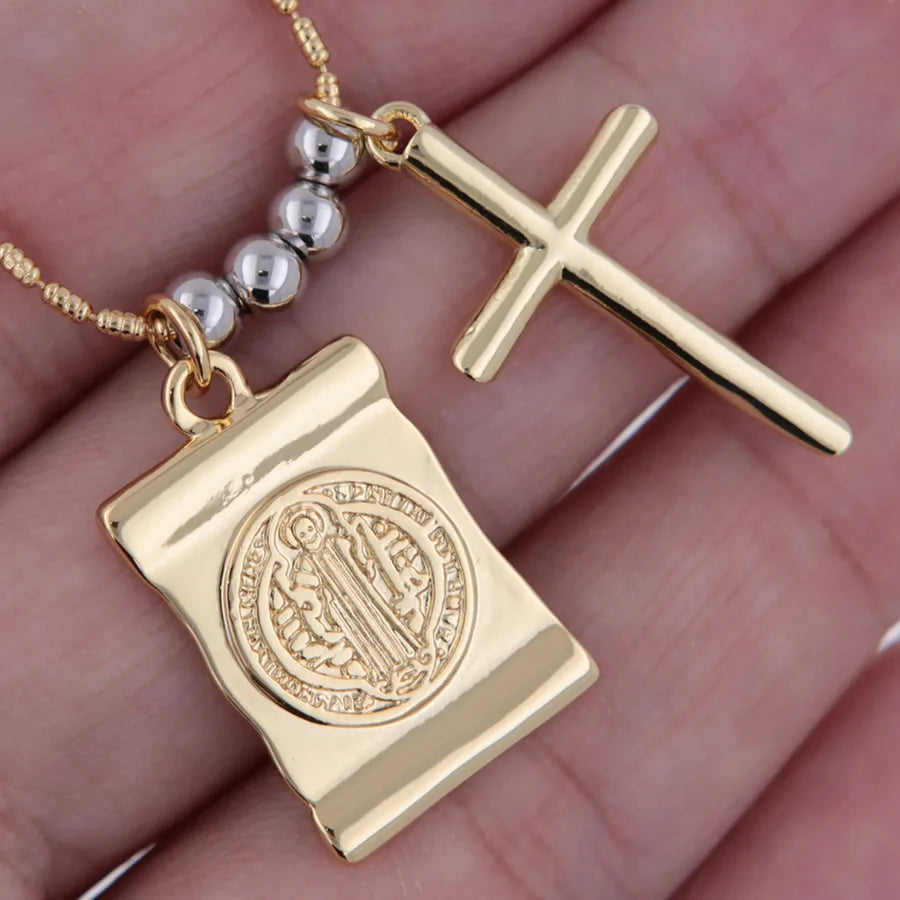 Elevate your style with this exquisite gold-plated necklace, featuring a classic cross pendant alongside a unique scroll design.