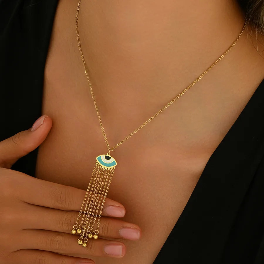 Enhance your elegance with our stunning Evil Eye Tassel Necklace.
