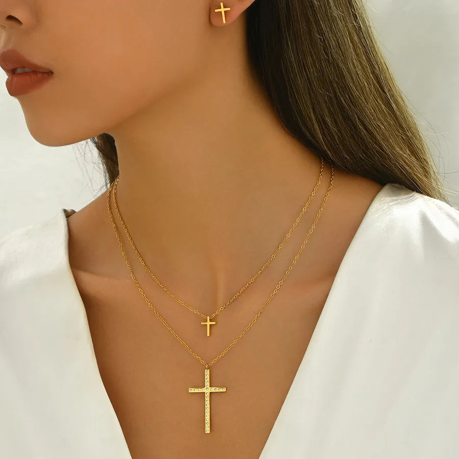 Elevate your style with this elegant gold-toned jewelry set, featuring a stunning layered necklace and matching cross earrings.