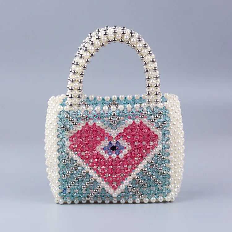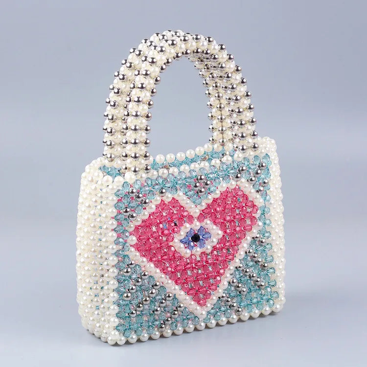 Unveil a world of elegance and whimsy with this exquisite beaded handbag. Expertly crafted with a delicate blend of pastel beads, this accessory is designed to captivate with its heart motif, shimmering in shades of pink, blue, and white.