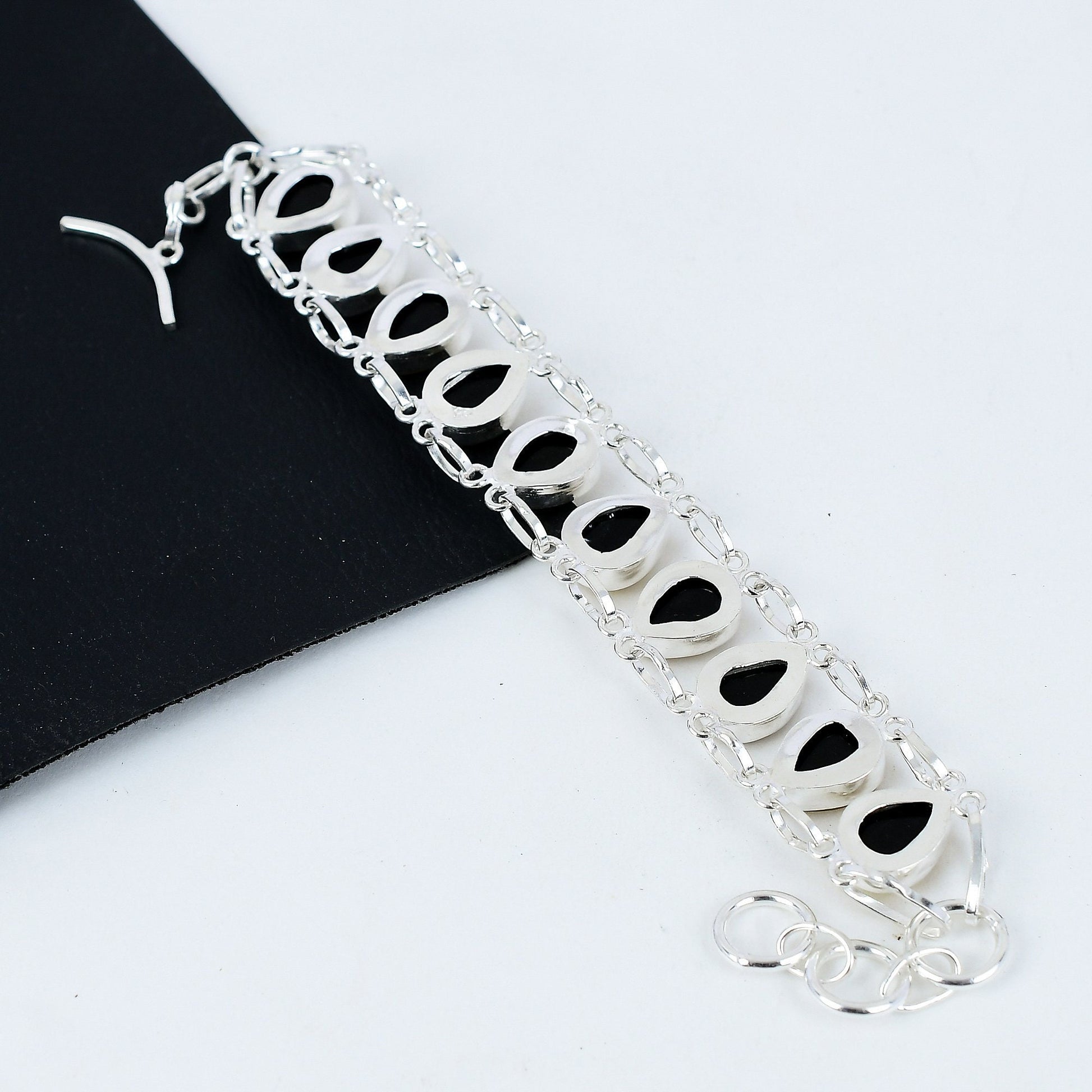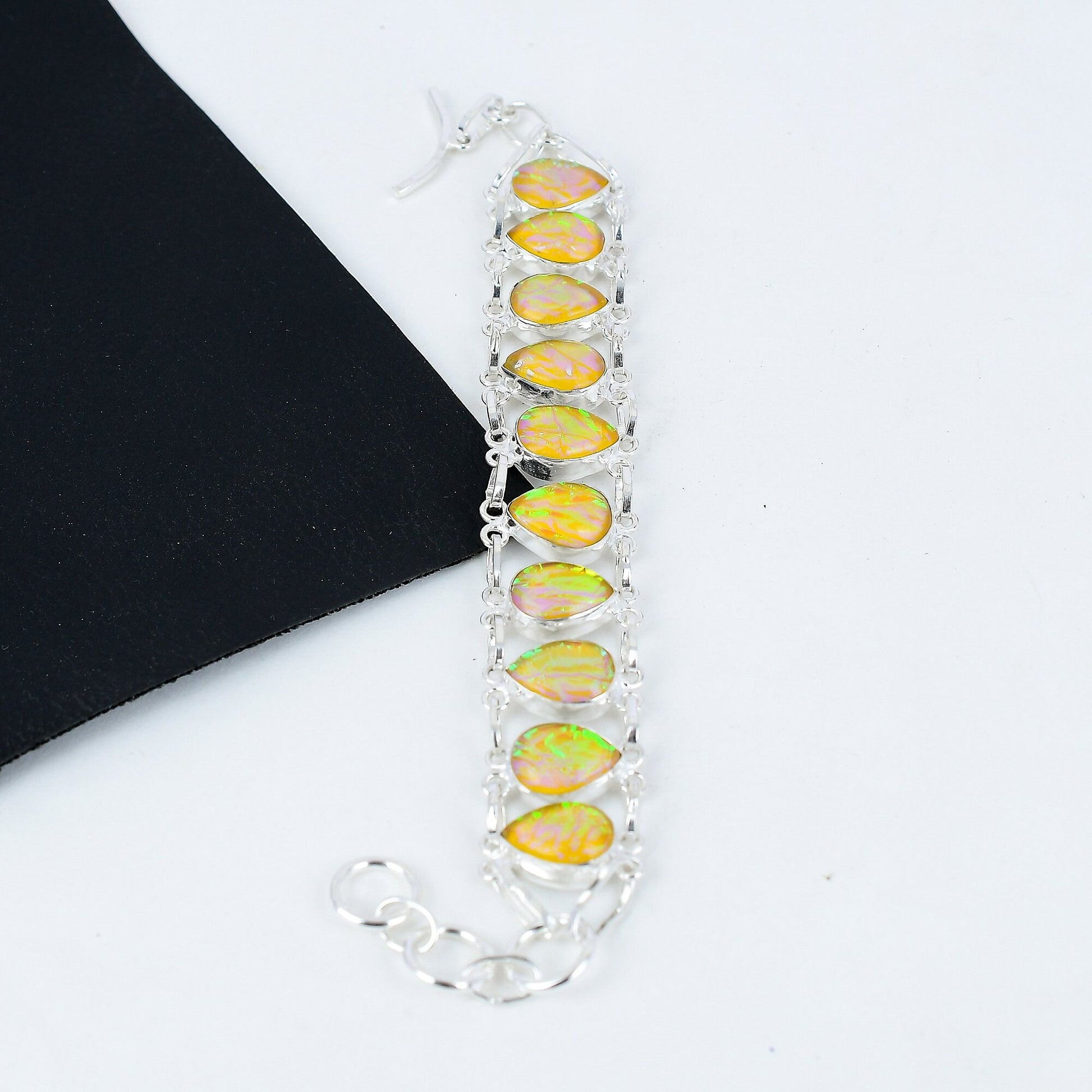 Embrace elegance with our stunning opal bracelet, featuring a series of iridescent teardrop opals set in a polished silver chain.